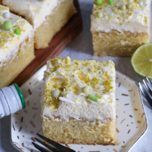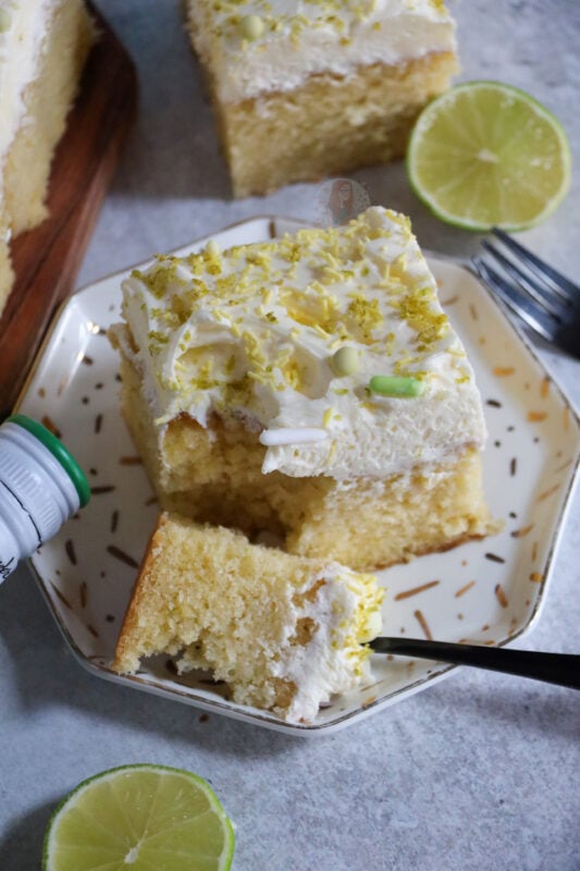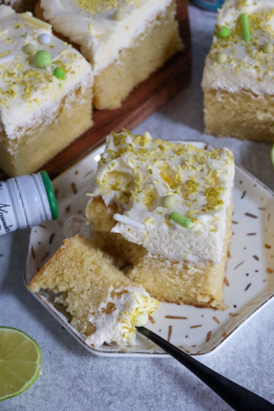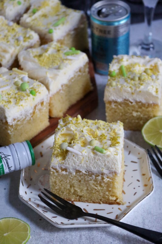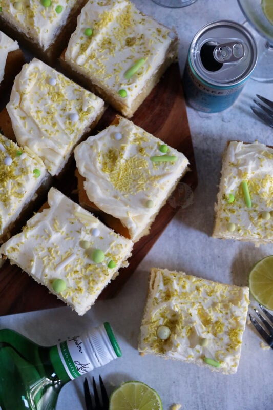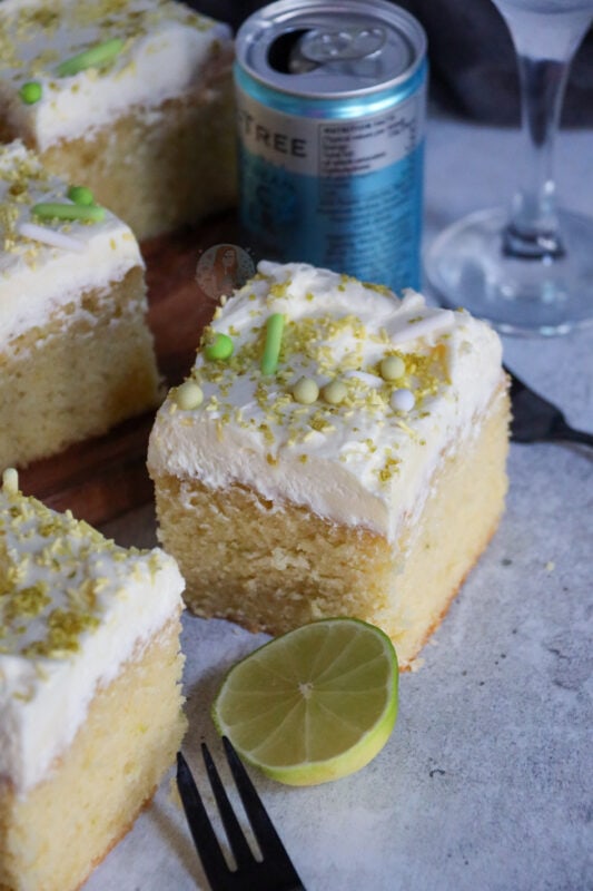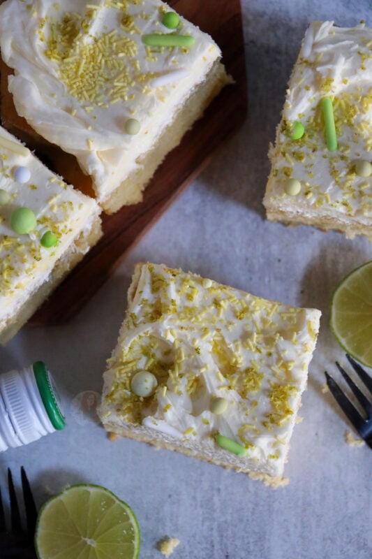 Traybake cakes are so much easier to serve at parties, you only need one tin, and you don’t need to decorate it in any particularly fancy way. Bake the sponge, slather on some frosting, and you are done! I just add lime zest and sprinkles to make it look pretty.