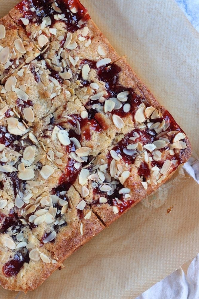 Almond and jam… a delicious combination. Usually there is a pastry base, a jam layer, and almond filling, and decoration on top. These blondies are basically the same, just without the pastry!