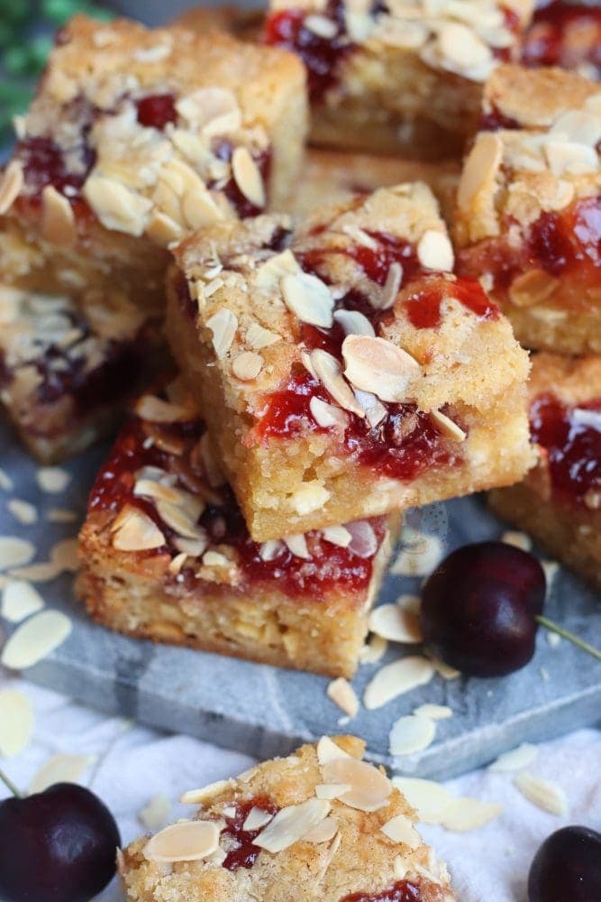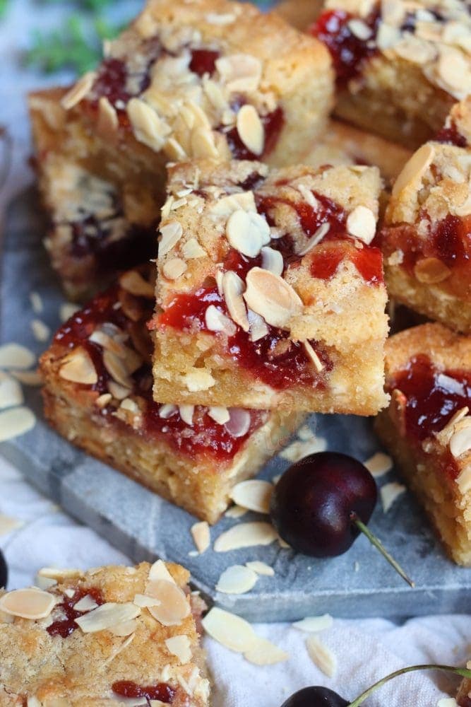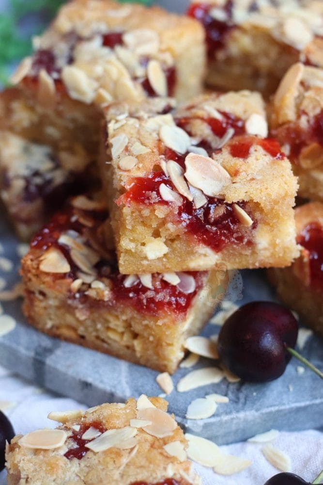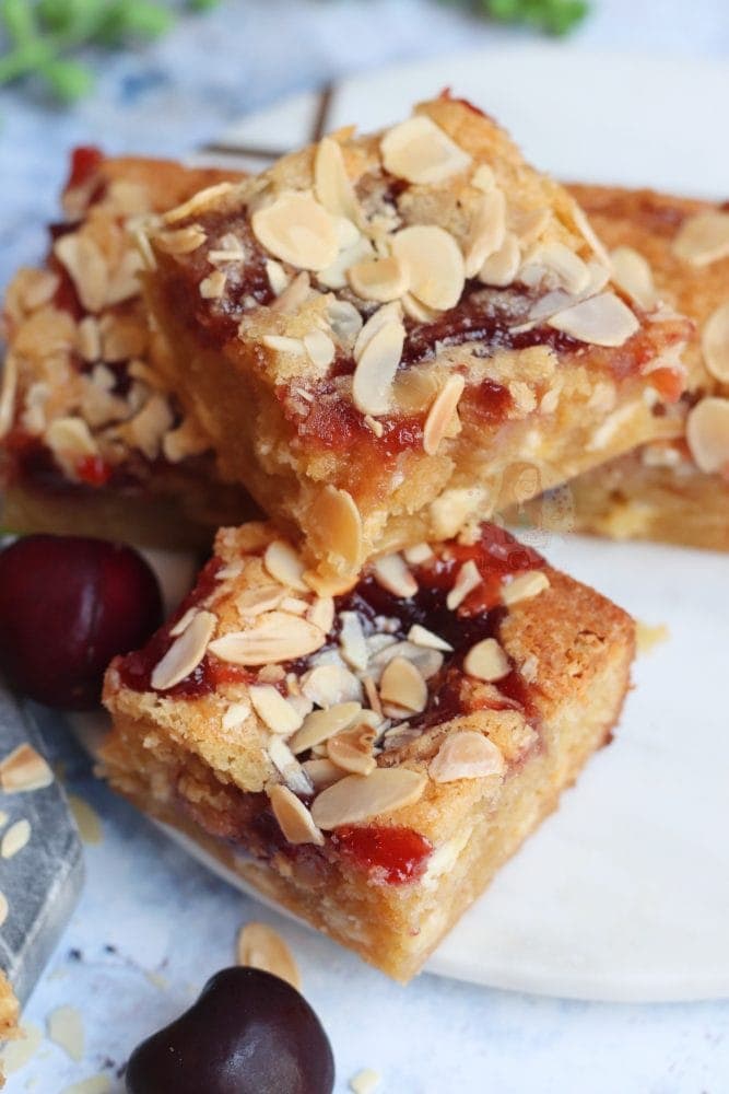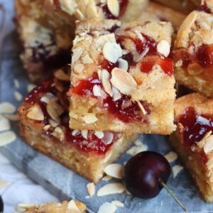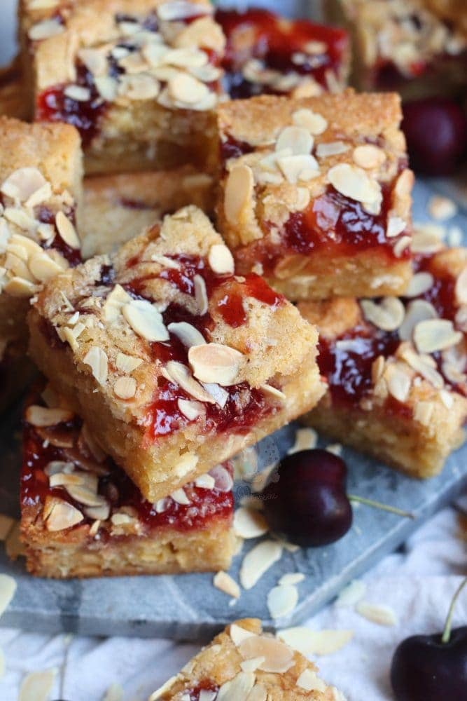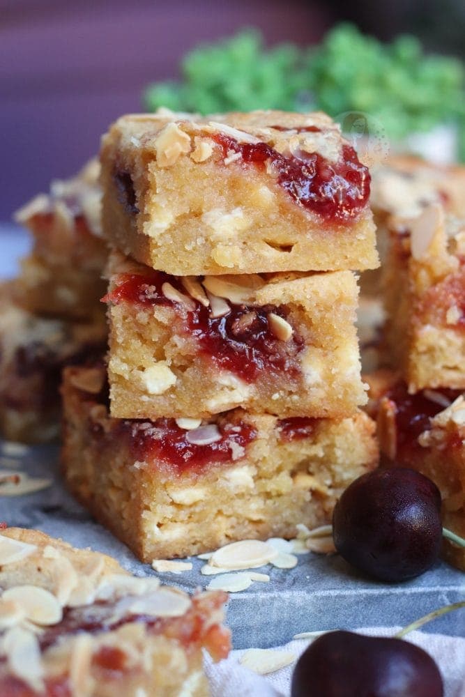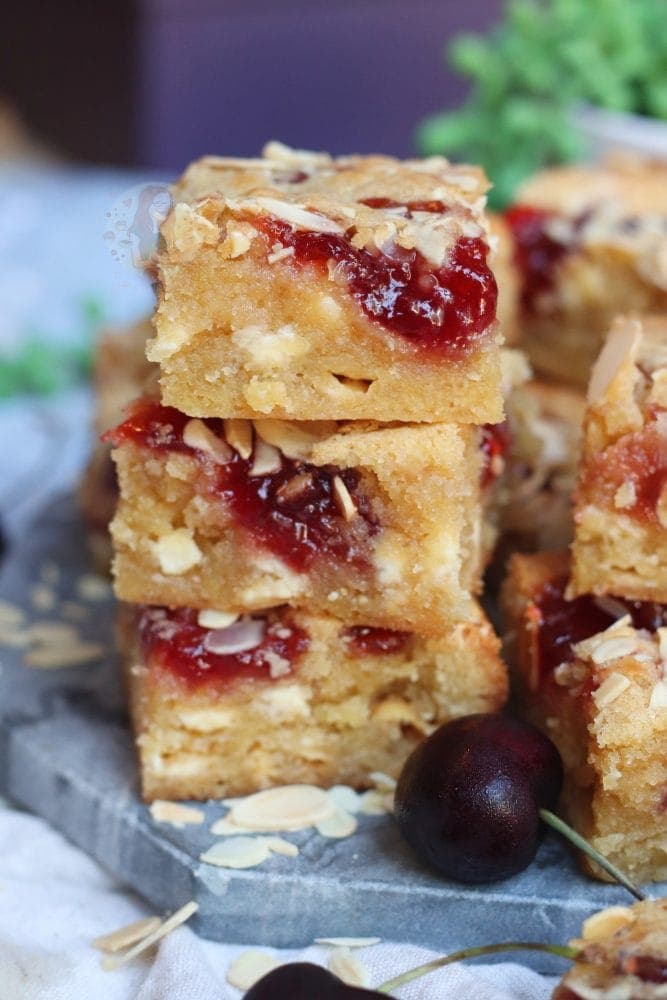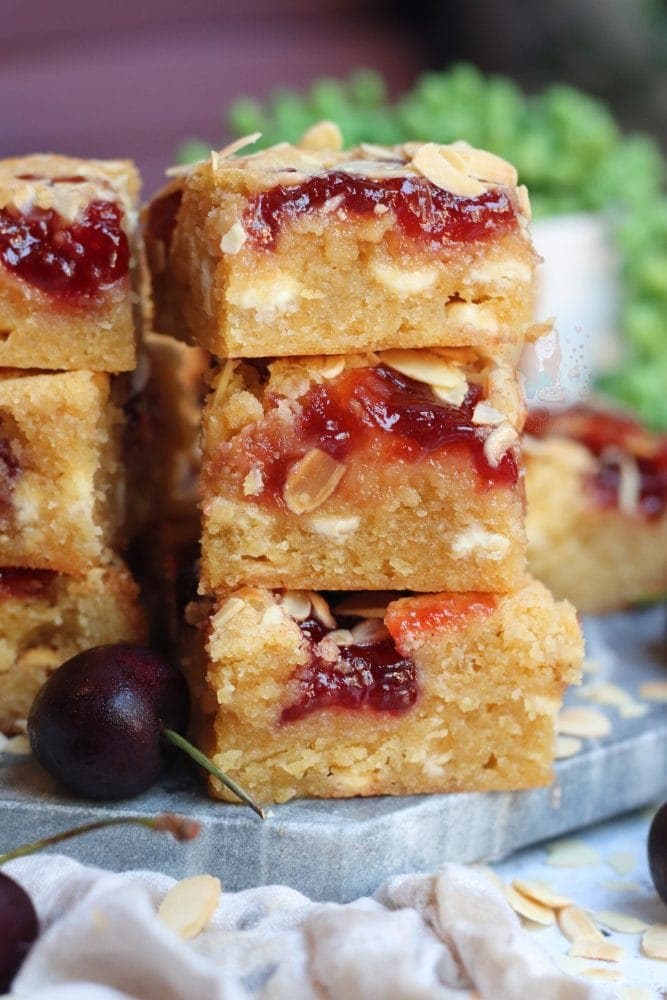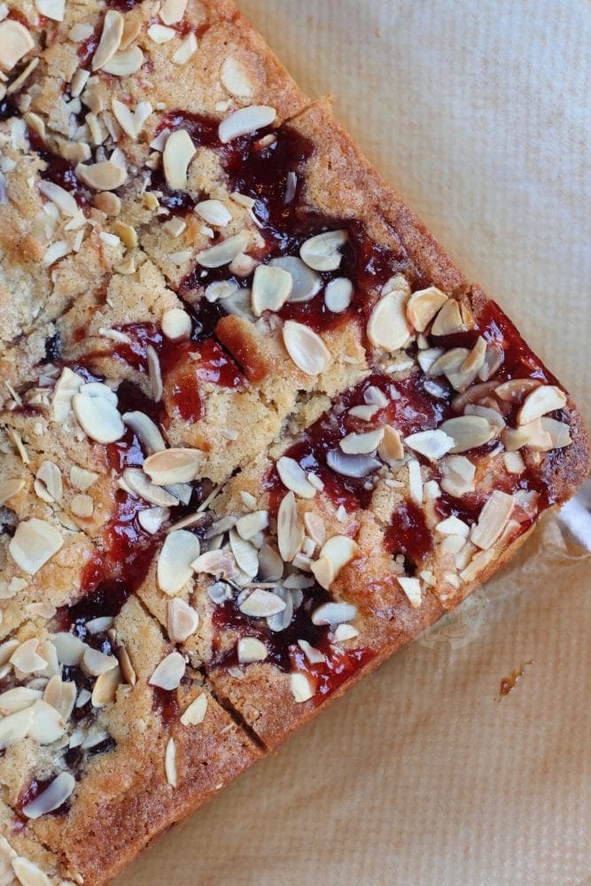 Thick and gooey bakewell blondies with almonds and jam!