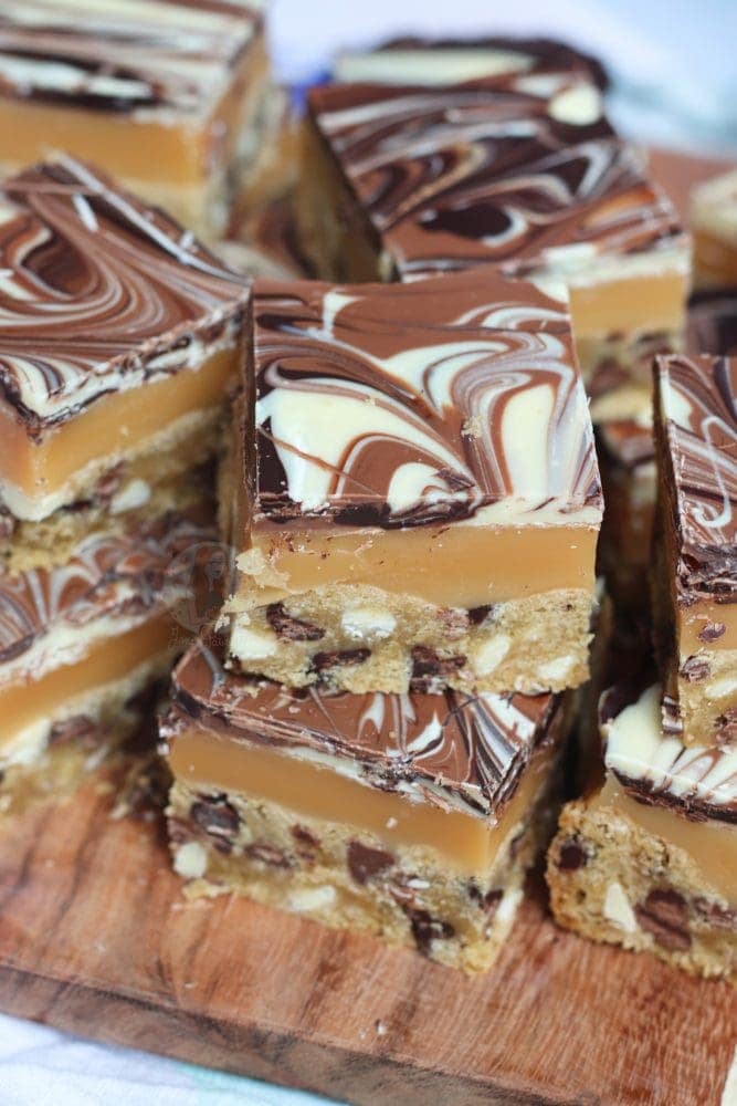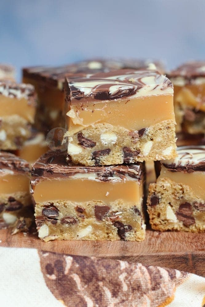Triple chocolate chip cookie bars, with homemade caramel, and a triple chocolate layer… millionaires cookie bars!