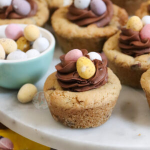 Mini egg cookie cups with chopped mini eggs, chocolate chips, and a whipped chocolate ganache topping… perfect for Easter!