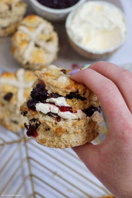 Now we all know how much I love mashing up baking ideas… I have many recipes already such as my carrot cake cheesecake, mince pie brownies, cheesecake loaf cake and so on! So when it came to Easter, I HAD to combine two of my favourites: scones + hot cross buns = heaven.