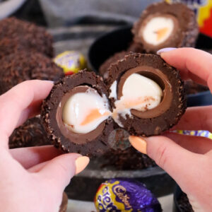 The batch of brownies does make more than the 500g of brownie you need, but that’s totally okay – you can freeze the rest, make your own brownie bites, or even just make a bigger batch of the Creme Egg scotch eggs if you preferred.