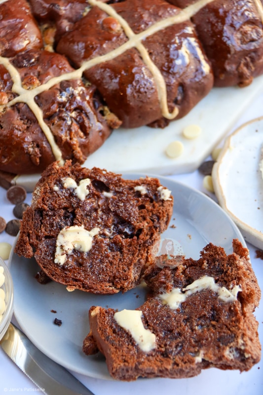 Delicious homemade chocolate hot cross buns with a chocolate dough filled with chocolate chips, perfect bake for Easter – and perfectly toasted and served with a little butter!