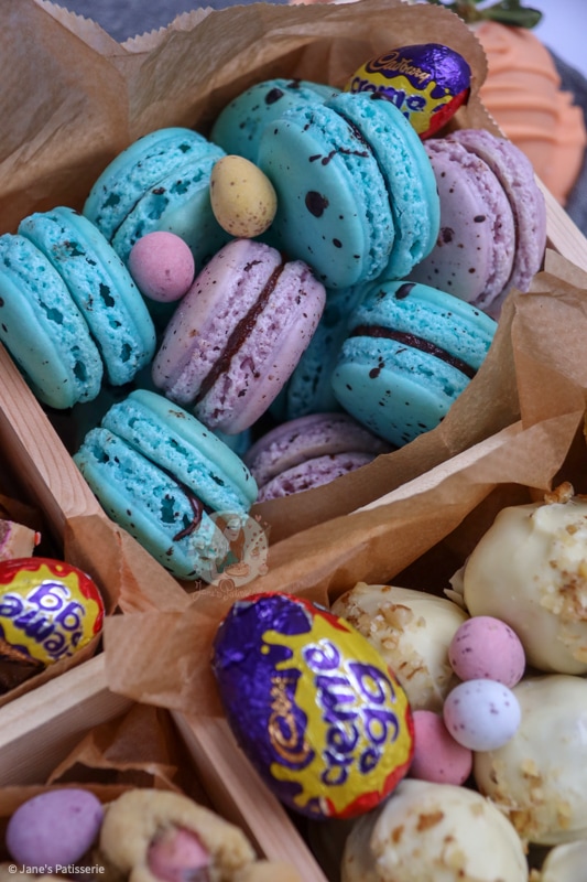 My easter macarons are a selection of colours, with a chocolate splatter to make a speckled look – and I am obsessed. Imagine adding some of these to your treat box with whatever colour you fancy – whether it’s a teal or purple like me, or a pale yellow, pink, white and so on!