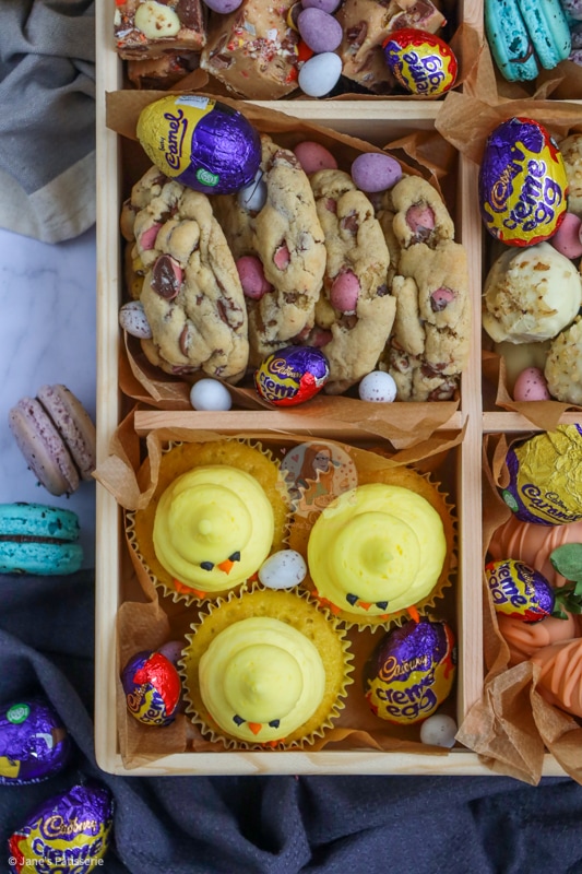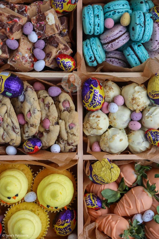 I have seen treat boxes over and over online, by cake sellers, and so on – and they are so fun! They are basically a combination of baked goods that fit the theme… whether it’s mothers day, valentine’s, christmas, or in this case; easter!