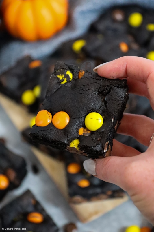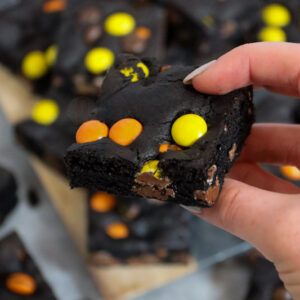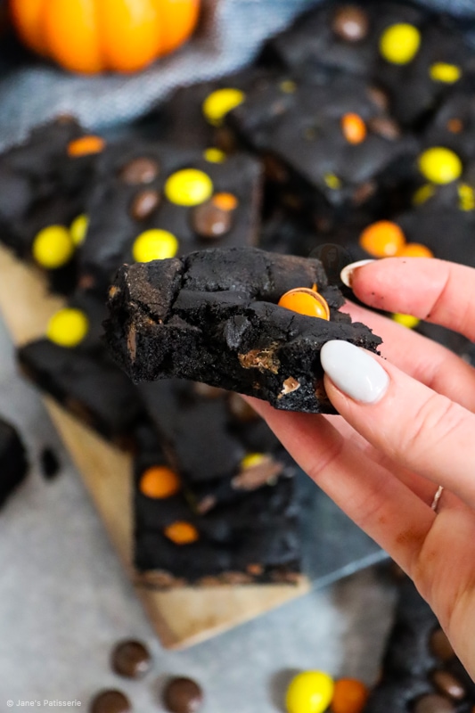 Spooky and terrifyingly tasty halloween cookie bars with a black cookie dough, and stuffed with chocolate halloween M&Ms!
