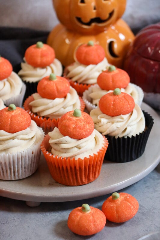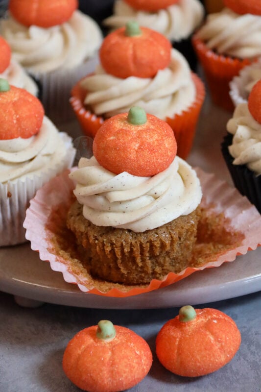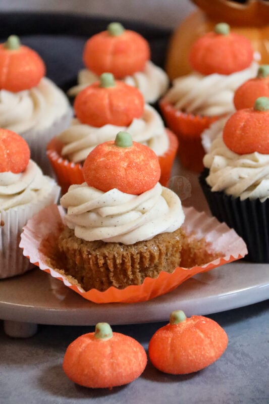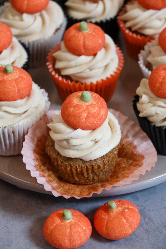 Whilst I haven’t tried it, you could try this recipe (https://www.janespatisserie.com/2015/10/19/pumpkin-cupcakes-with-cream-cheese-frosting/) but the same spices as this pumpkin spice one, and substitute the grated pumpkin for the puree?!
