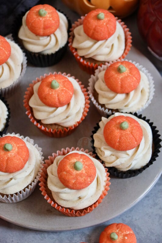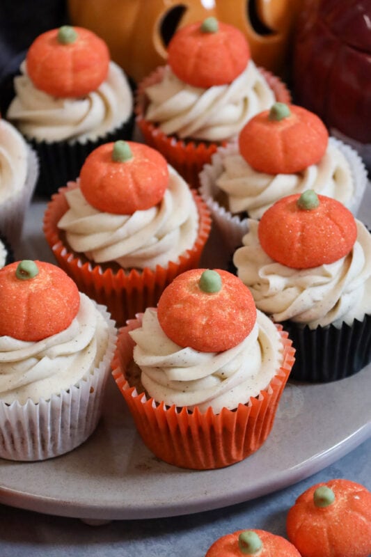 I love using a large star piping tip with large disposable piping bags to create a gorgeous swirl of buttercream – it also creates a nice sized ‘platform’ for your pumpkin marshmallows (or whatever decoration you fancy!).