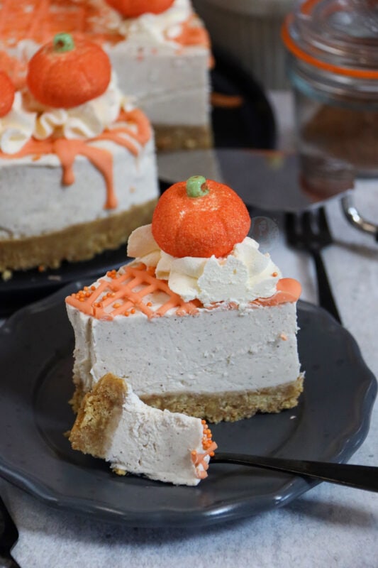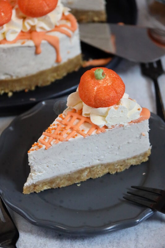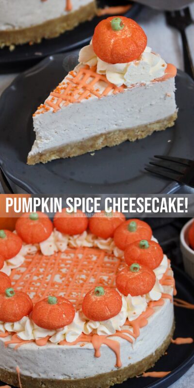 Perfect treat for Halloween and Autumn, a no-bake pumpkin spice cheesecake. DIY pumpkin spice, and an easy vanilla cheesecake are perfect together!
