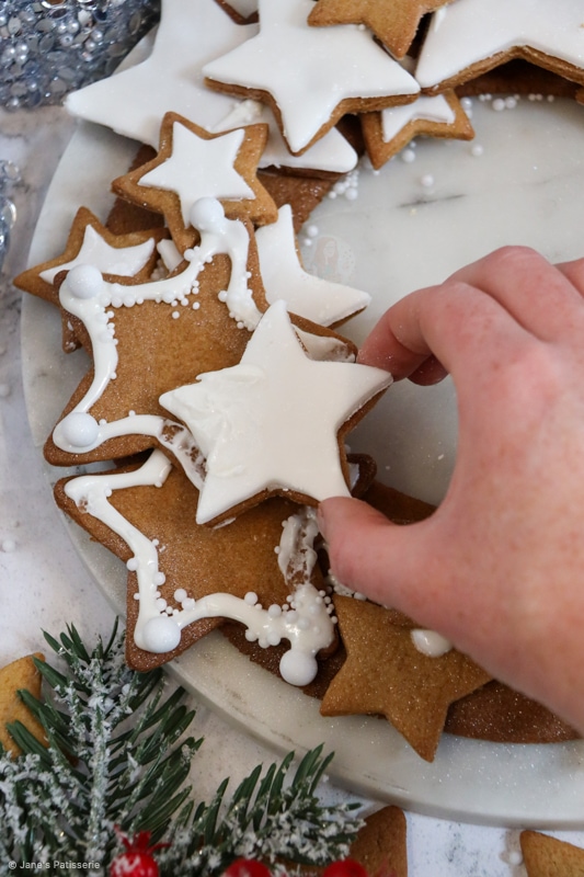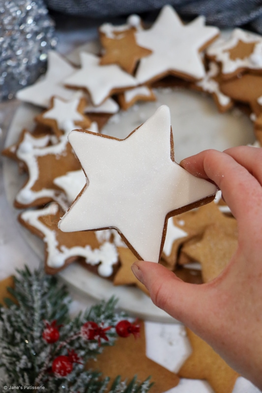 The royal icing acts as the glue for the biscuits, so you pipe some onto the base, and touching areas of biscuits as you stack and create the wreath. I used water to stick the roll out icing to the gingerbread cookies and it worked wonderfully.