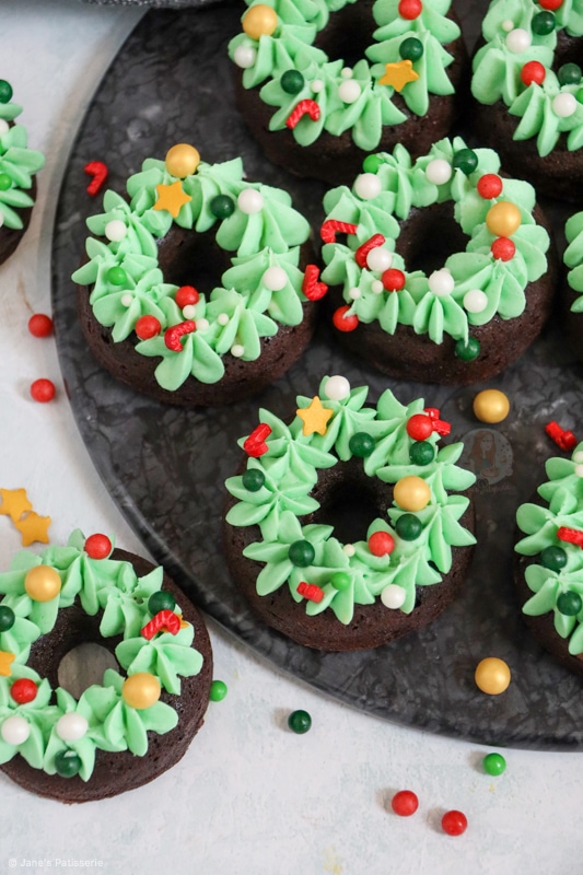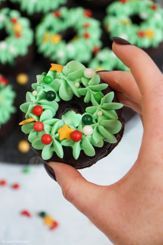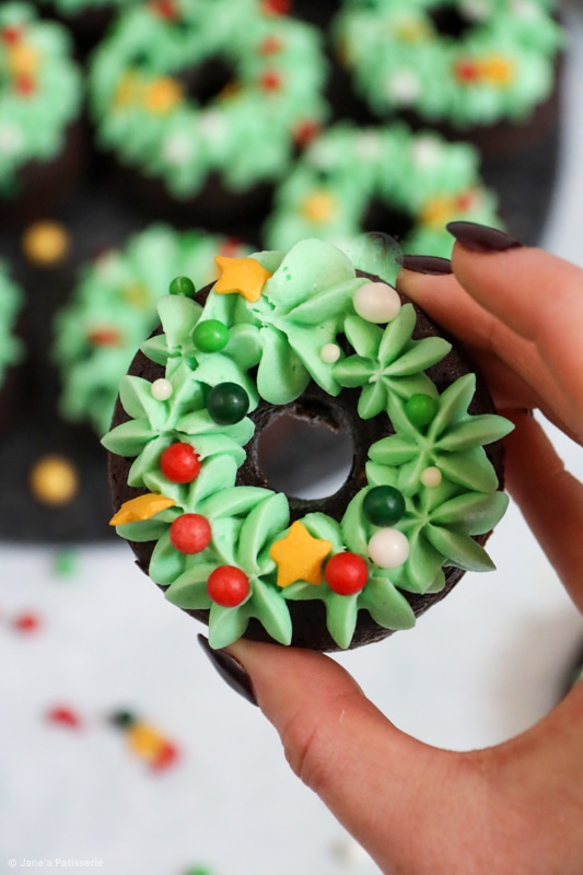 I used a 2d closed star piping tip to pipe little stars onto the bronuts in circles to basically make the wreath decoration, and it’s so simple but it worked so incredibly well!