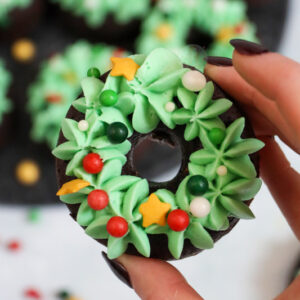 Say hello to the cutest little edible Christmas wreaths you fill find this festive season! They are sweet, super chocolatey, and yes, they are brownie doughnuts. HELLO!!