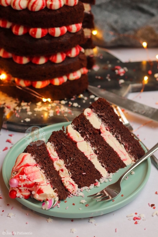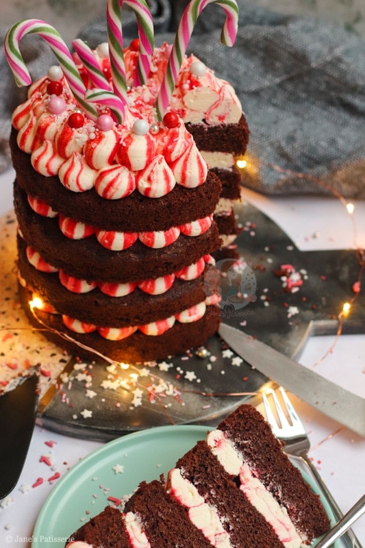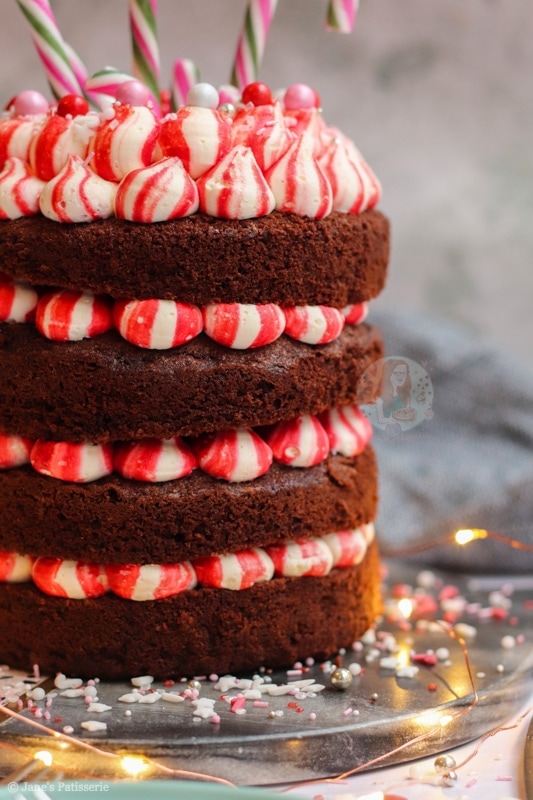 A four-layer chocolate peppermint cake with chocolate sponges, red striped peppermint buttercream frosting – and more! A delicious easy festive cake.