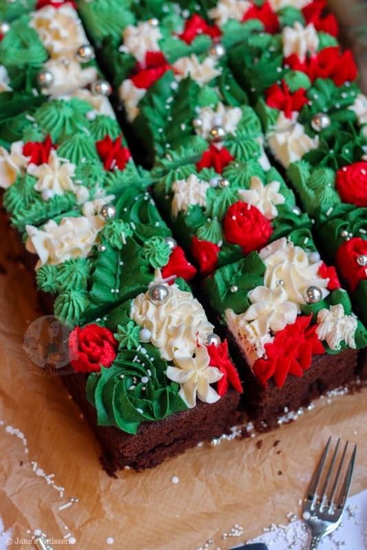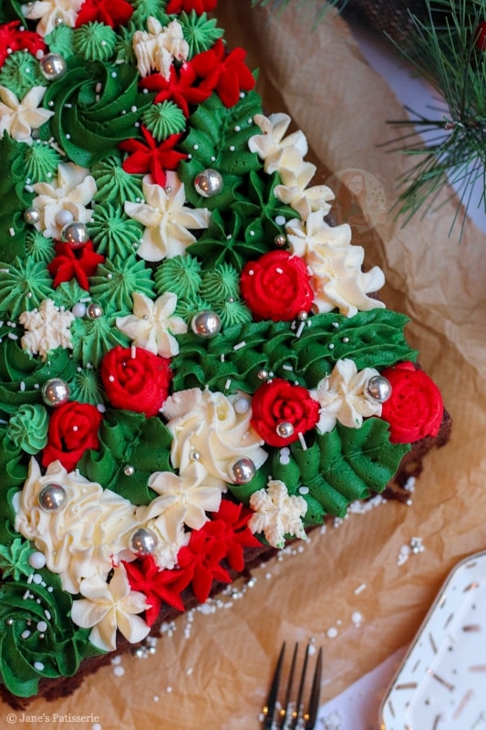 A delicious and moreish chocolate cake, topped with beautiful american buttercream frosting, in all the different festive patterns!