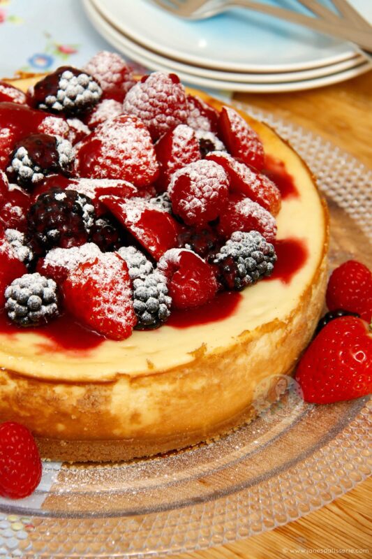 Creamy & Sweet Baked New York Cheesecake with Homemade Coulis & Fresh Fruit – Definite Dinner Time Showstopper!