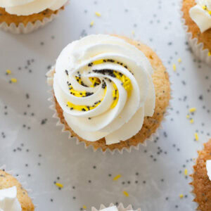 Luscious and light lemon & poppyseed cupcakes topped with lemon buttercream frosting.