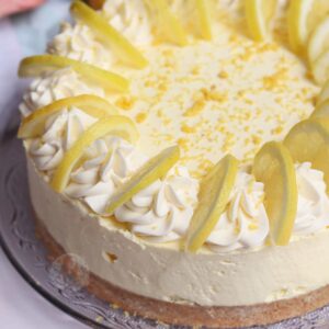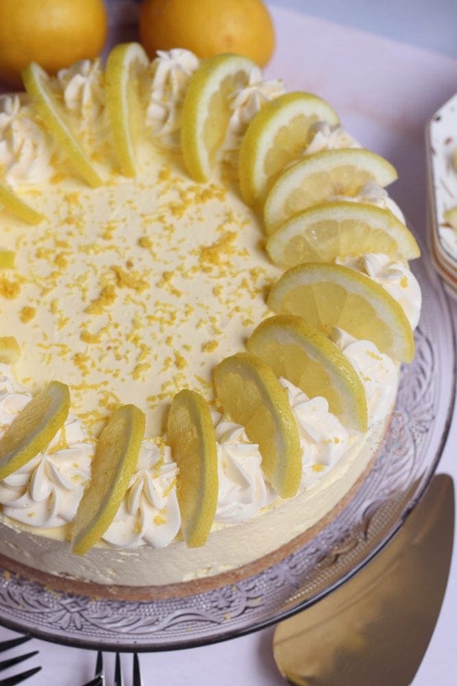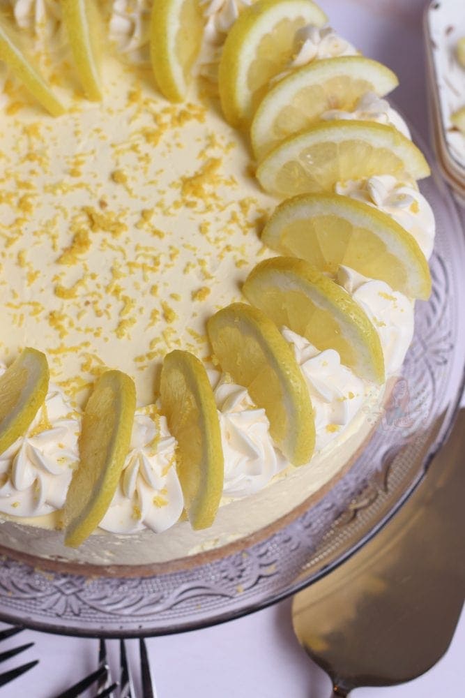 I decorate my cheesecake as per usual, with some whipped cream swirls, and the theme of the cheesecake. This time? Lemon slices, and lemon zest. All done, and delicious. You can add in anything you want such as chocolate drizzle, but I really was just sticking to the lemon theme personally for this one.