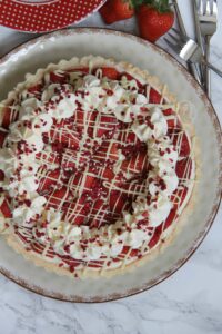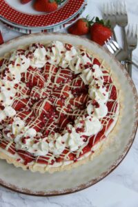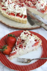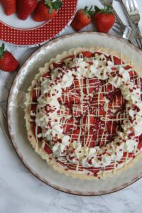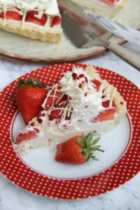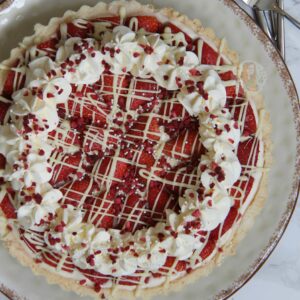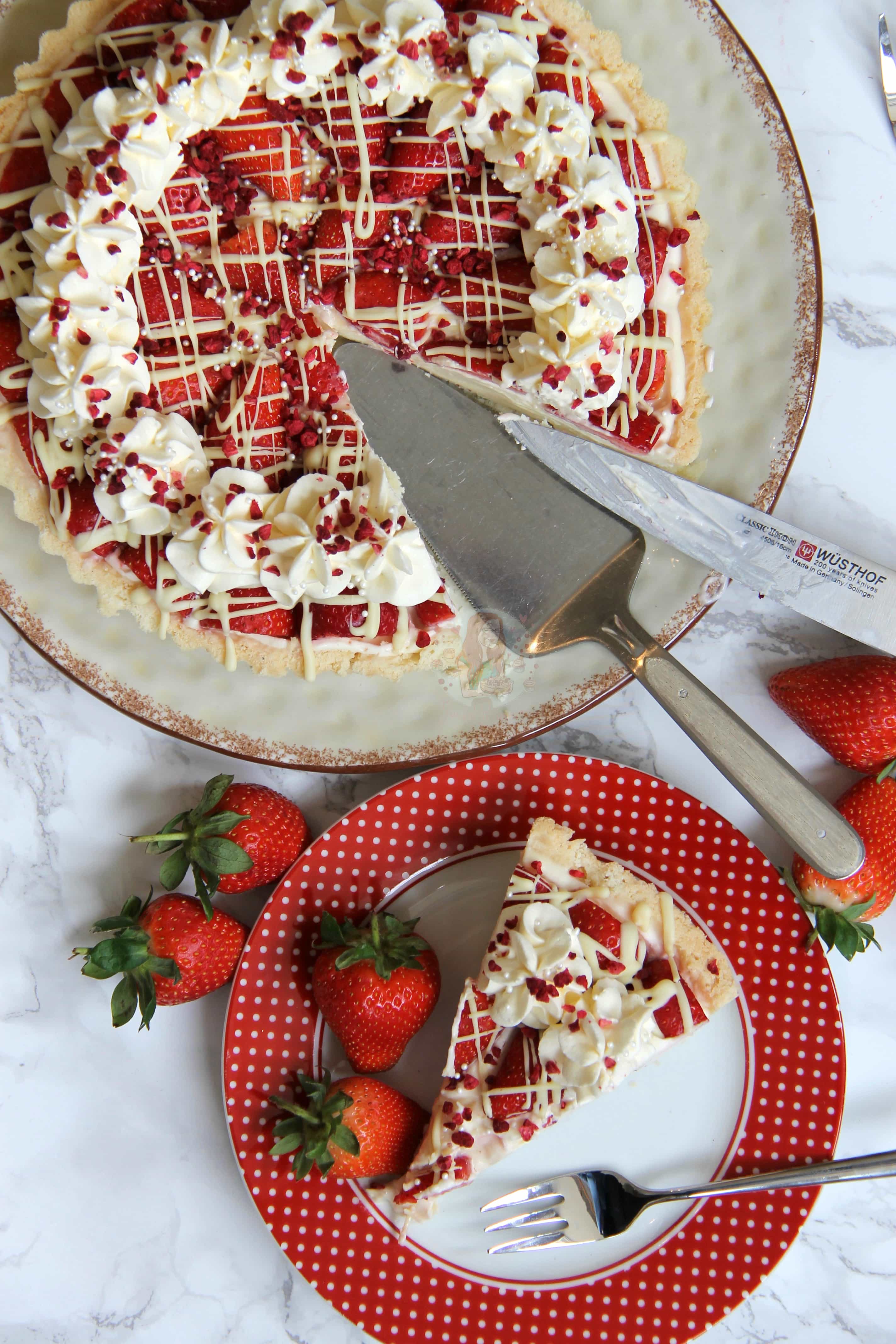 Sweet Shortcrust Pastry, Creamy White Chocolate Filling, Fresh & Freeze Dried Strawberries, Sweetened Cream, and even more Chocolate! The most Delicious White Chocolate & Strawberry Tart!