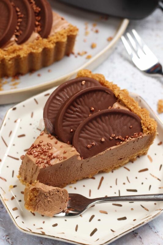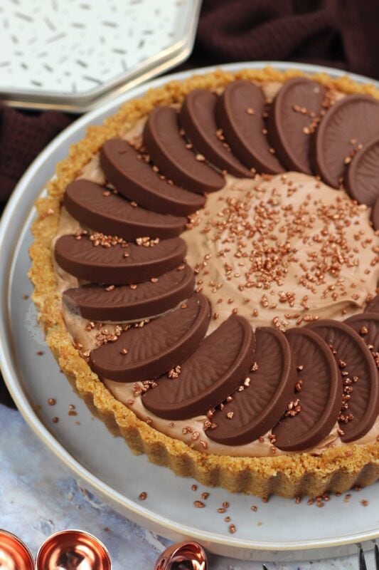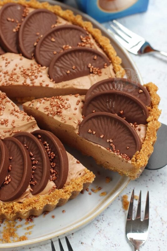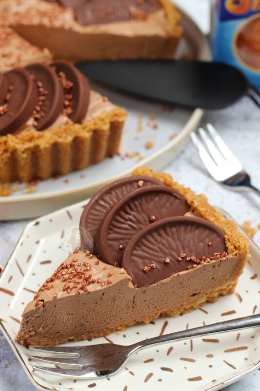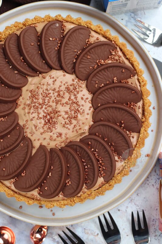 A DELICIOUS no-bake Terry’s chocolate orange tart – a no-bake biscuit crust, and a creamy chocolate orange filling… heaven!