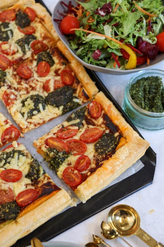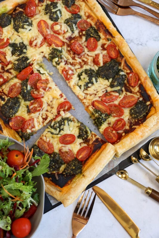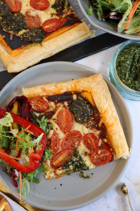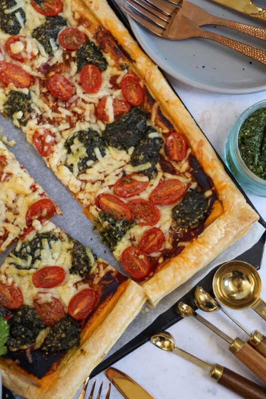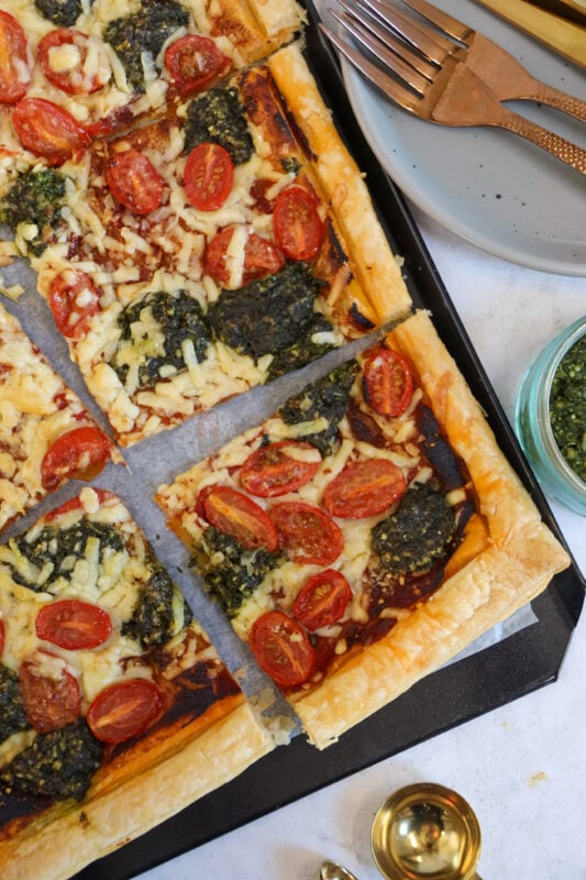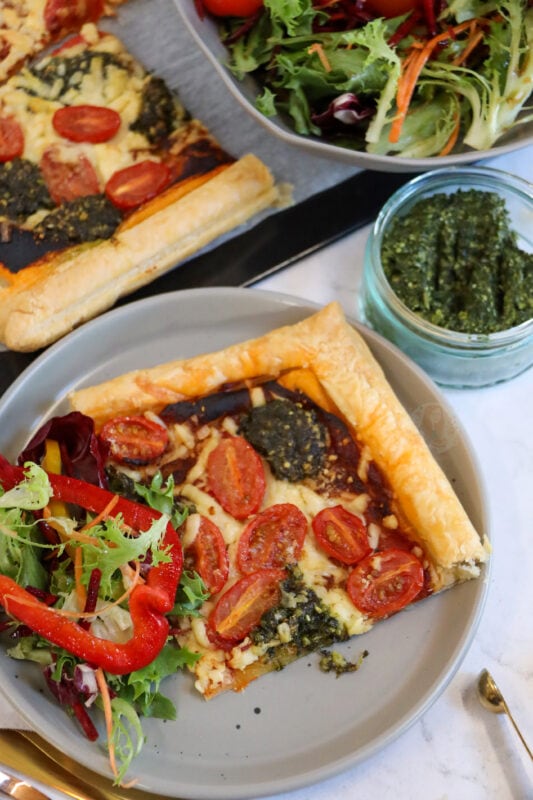 Pesto, cheese and tomato puff pastry tart – incredibly easy go-to dinner idea for families!