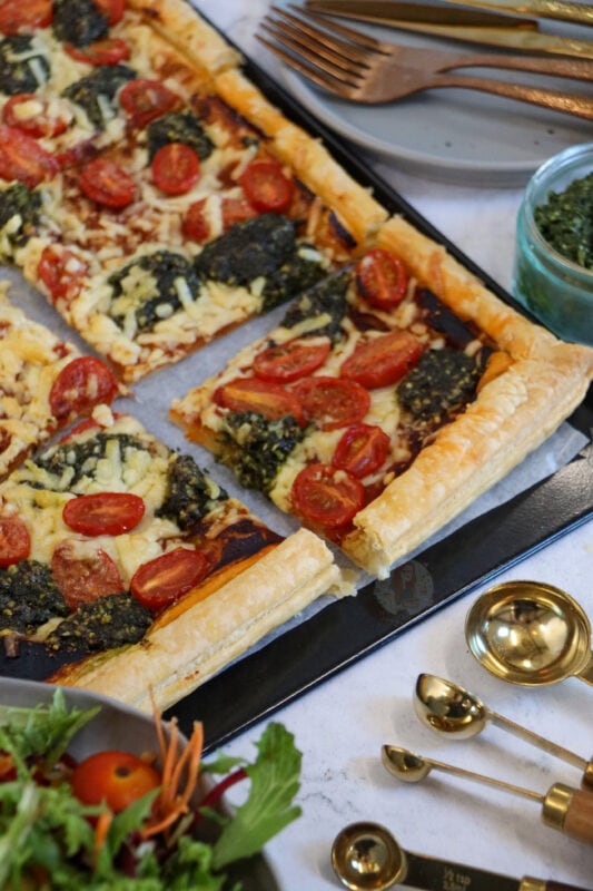The flaky puff pastry married with the pesto and cheese makes this tart so tasty and the ratio of topping to pastry is just perfect – I just love it! With the tomatoes then spread on top, you get all flavours in each mouthful – you will find it hard to just have one slice!