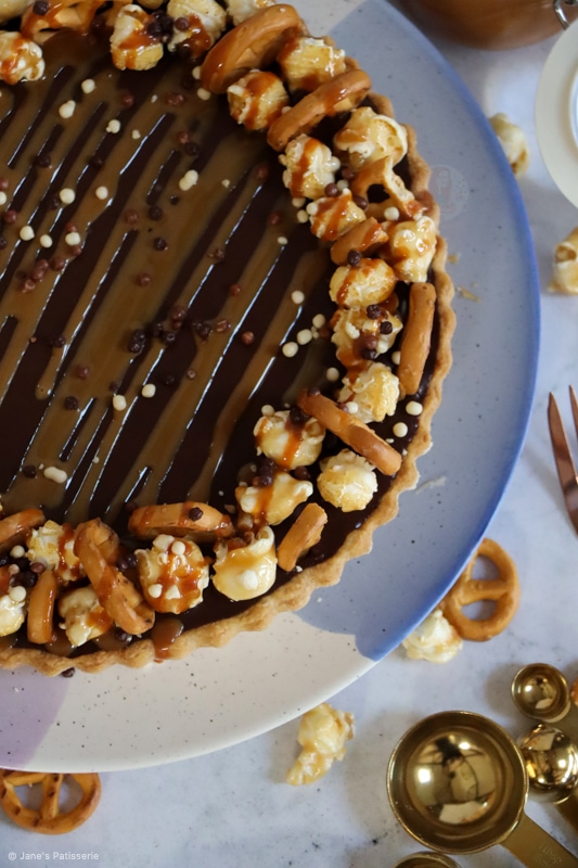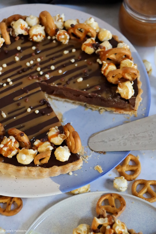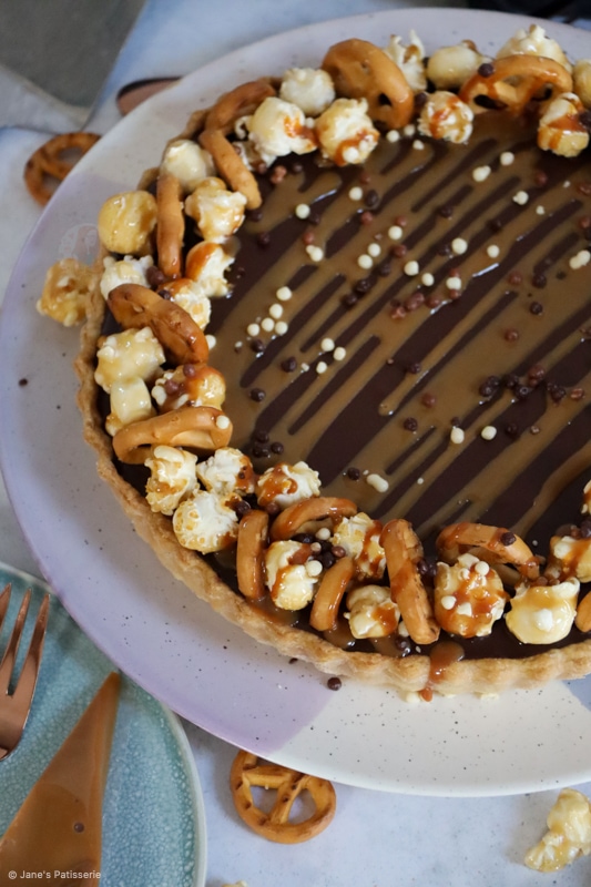 This recipe has a DELICIOUS sweet and thin pastry base and sides, with a scrumptious salted caramel layer, topped with the most delicious chocolatey ganache filling – so unbelievably tasty a combination.