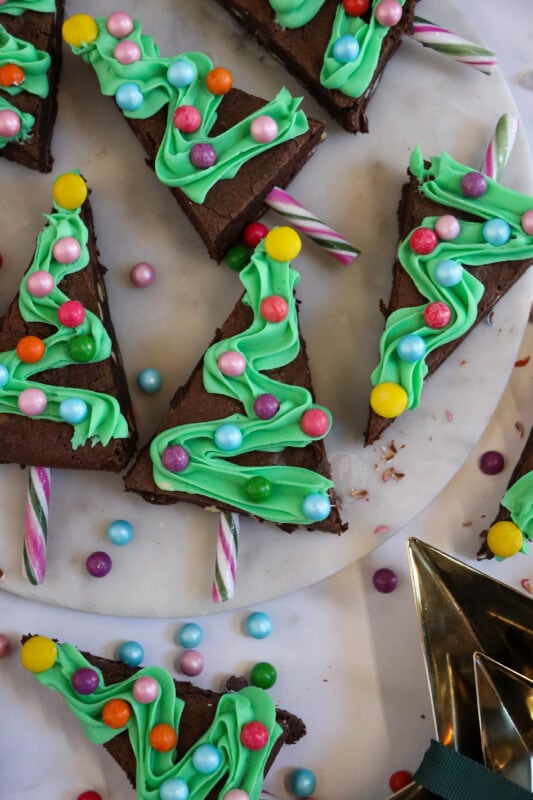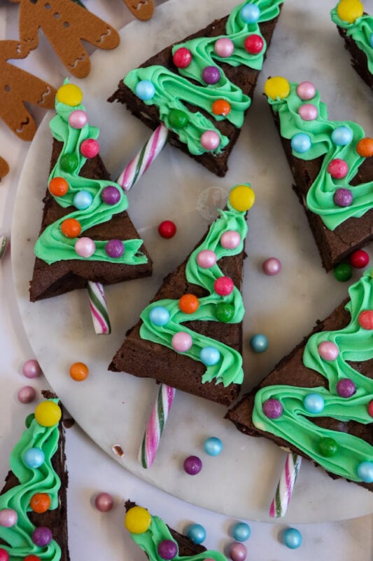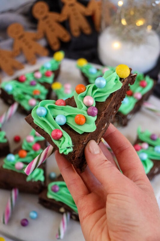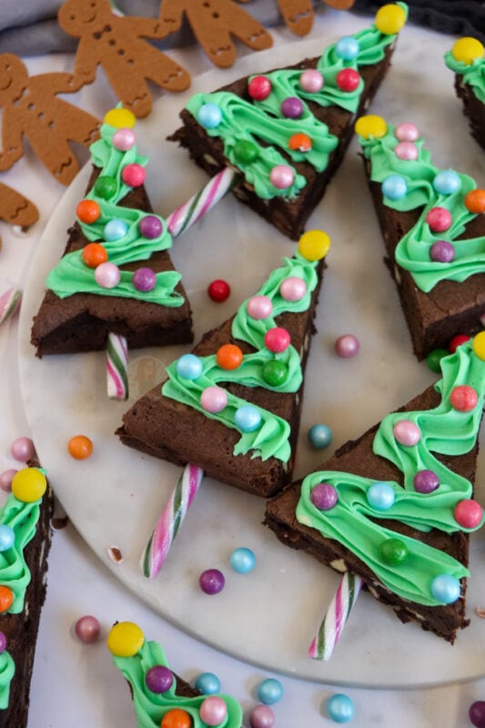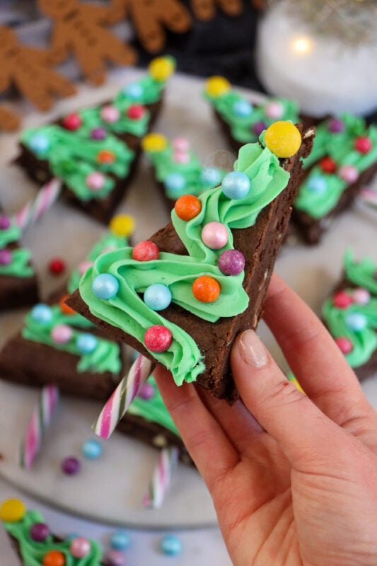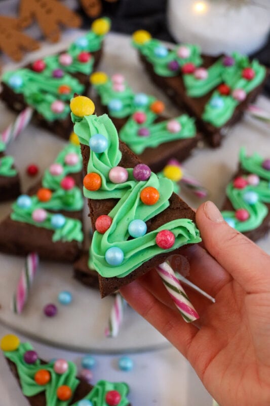 I tend to push the base of the candy cane in first, and then pipe the green on top. I used a 2d closed star piping tip for the green and then some more bauble like sprinkles as they are cute and colourful. You can buy some moulds that will make a triangle shape for your brownie anyway, but using a square tray works for me.