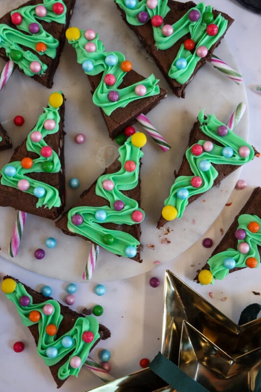 - Once cooled, cut the brownies into the tree shapes – I cut the tray in half, and then triangle the two halves – and eat all the offcuts. Carefully insert the candy cane sticks into the base of the brownies (like shown!)