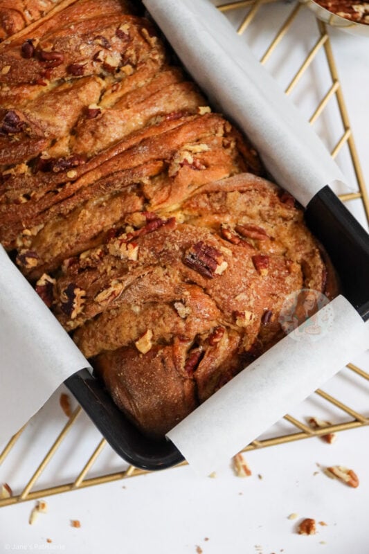 You can line the tin if you wish, I tend to add a strip of parchment to make it easier to get it out of the tin, but that’s up to you. Once the oven has preheated, you can bake in the oven until it’s golden. I leave it to cool for about 30 minutes, and then remove and drizzle with caramel to have a warm and scrumptious slice of caramel pecan babka.