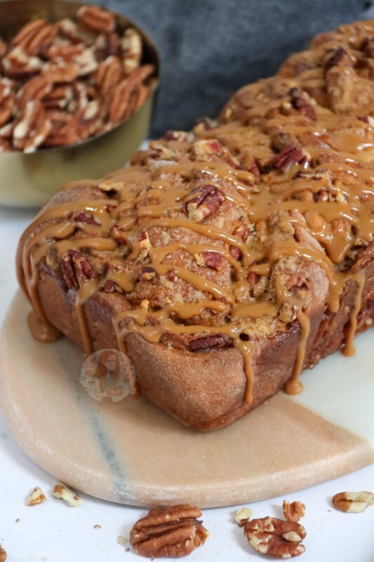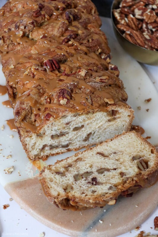 A delicious homemade bread with a pecan brown sugar swirl, drizzled with caramel… my caramel pecan babka is amazing!