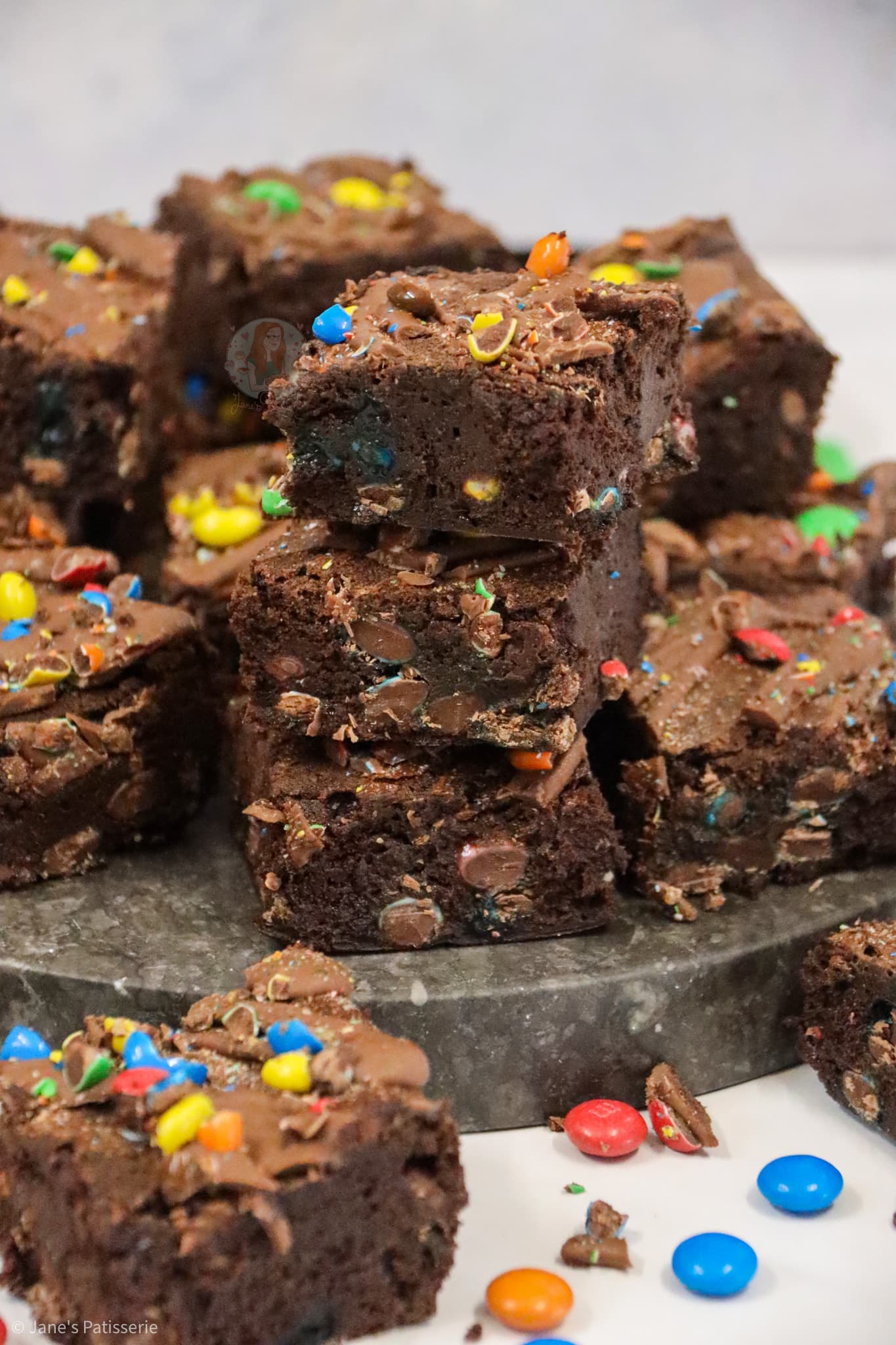 Fudgey and delicious M&M brownies with a delicious chocolate brownie, stuffed full of M&Ms and even more goodness on top!