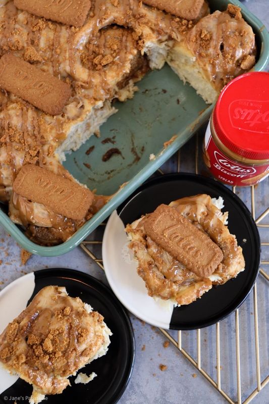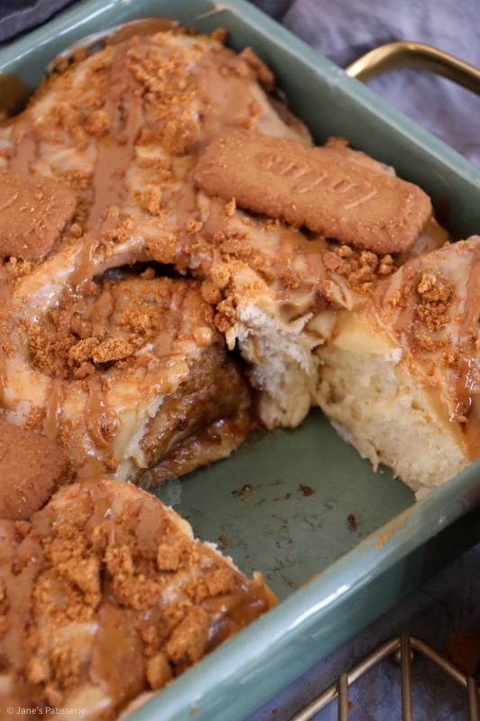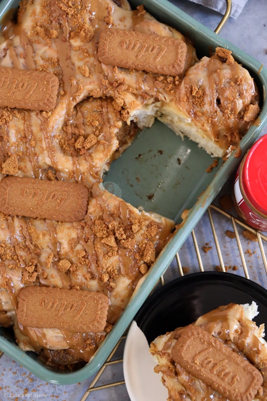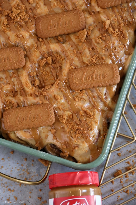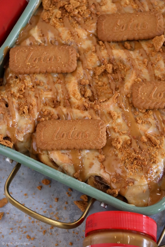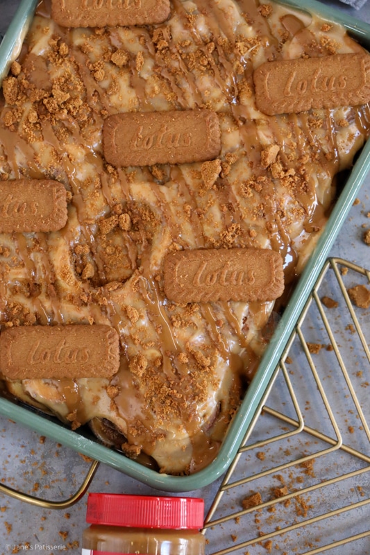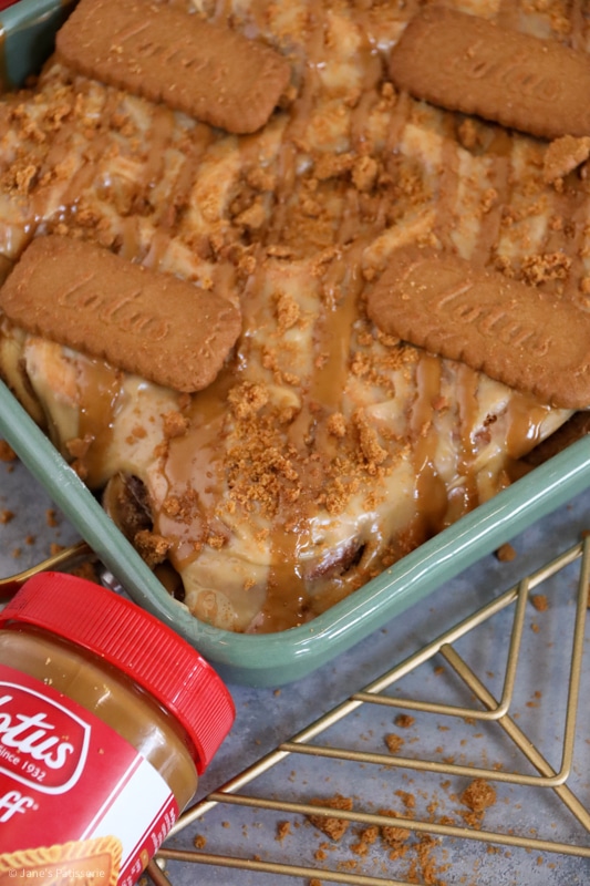 Delicious biscoff rolls with a biscoff cinnamon sugar centre, a cream cheese biscoff glaze and more!