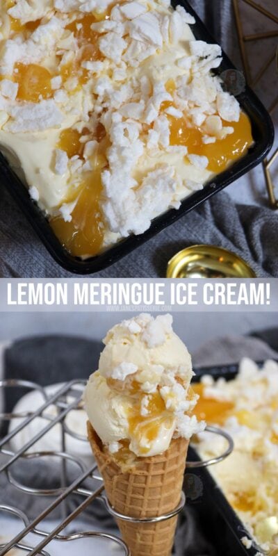 Delicious no-churn lemon meringue ice cream with a lemon ice cream, lemon curd, and meringues throughout!