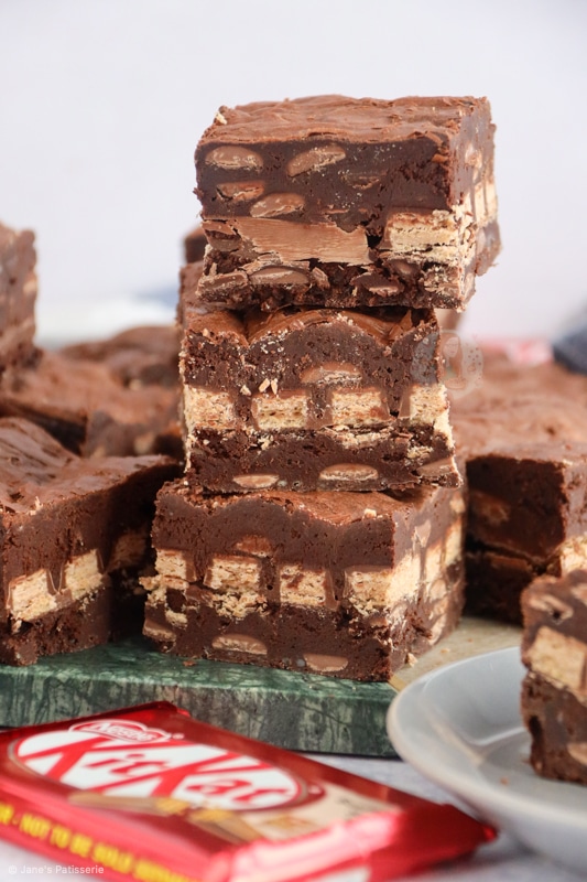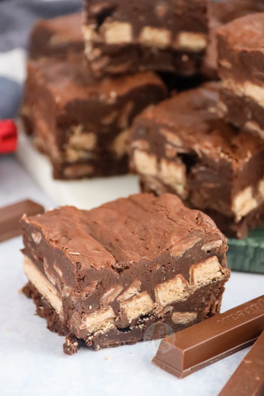 Deliciously fudgey chocolate chip KitKat brownies with a gooey chocolate chip brownie base, stuffed to the brim with KitKats!