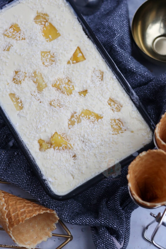 I used chunks of pineapple from a tin, and desiccated coconut for this pina colada ice cream because I liked the texture and extra flavour!