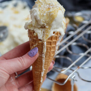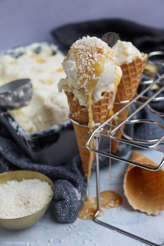 I tend to serve my pina colada ice cream in waffle cones as they are my favourite, but it scoops well into a bowl, you can blend it with extra rum for a pina colada milkshake with a kick, or even just eat it out of the tub – we’ve all been there.
