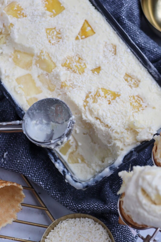 Delicious no-churn pina colada ice cream with a coconut pineapple base – super easy to make and so tasty!