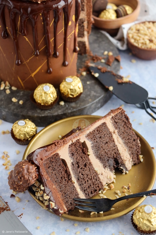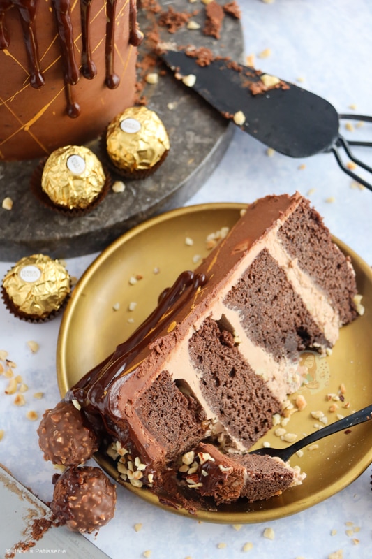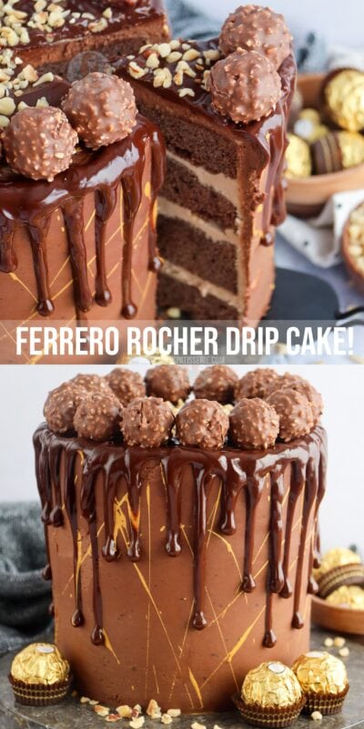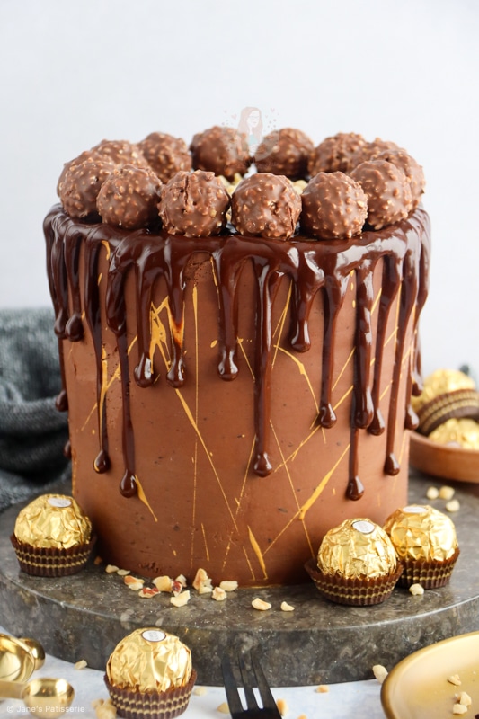 A delicious Ferrero Rocher Drip cake with four layers, Nutella buttercream, chocolate ganache and more!