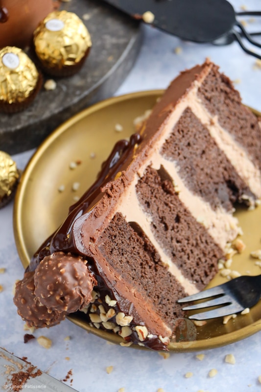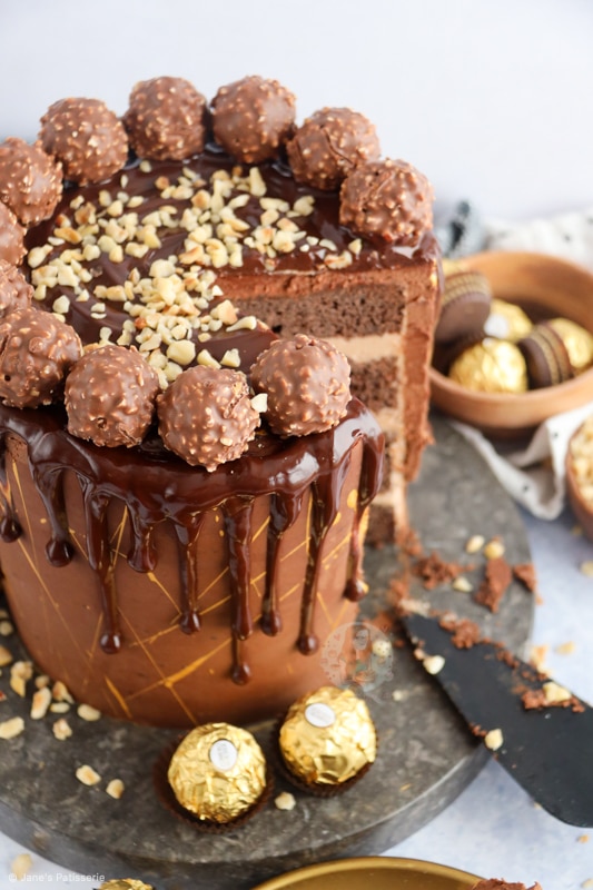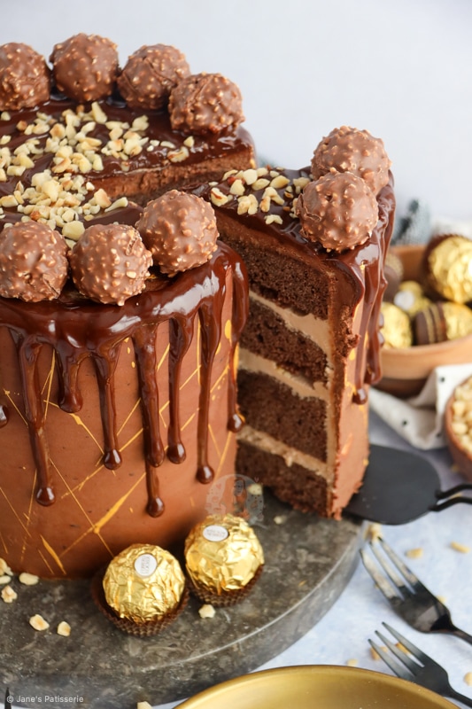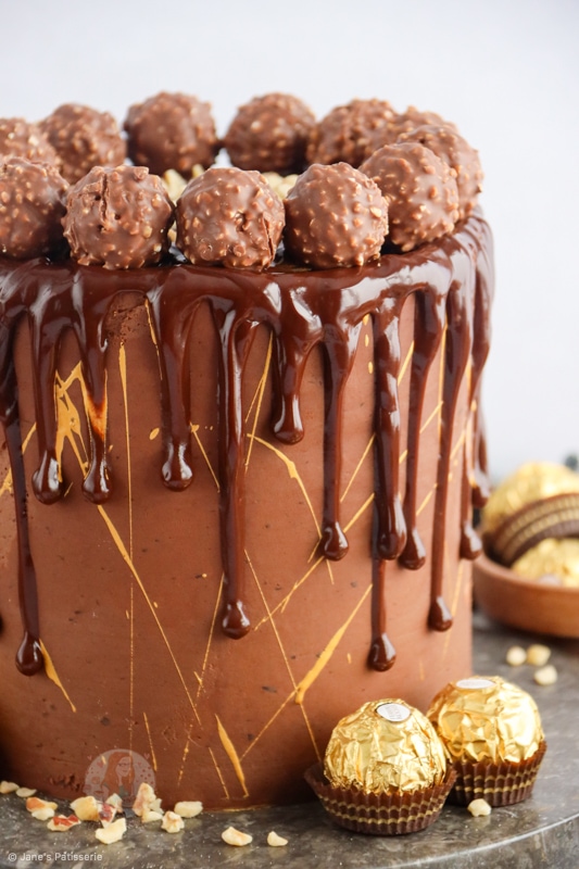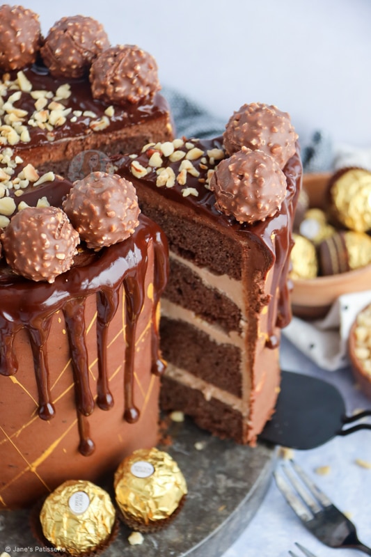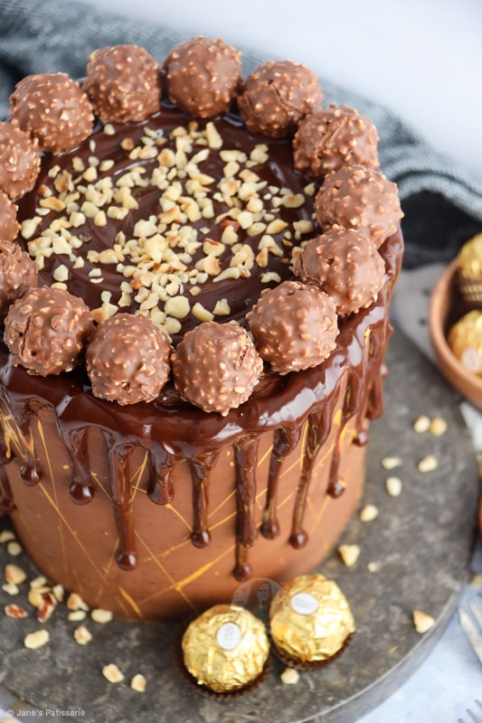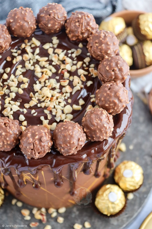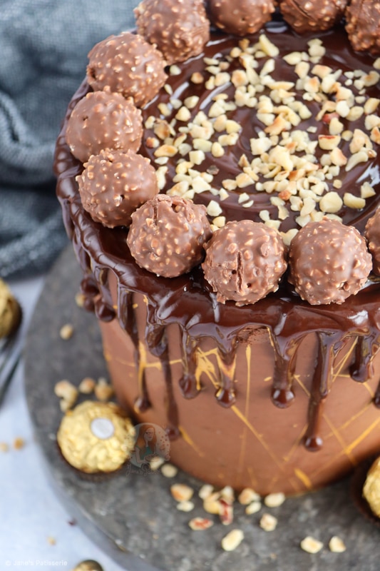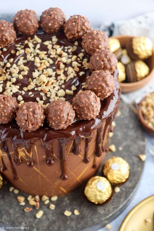 - Using a small piping bag or spoon, drip this down the sides of the cake. Top the cake with the Ferrero Rocher and rest of the chopped hazelnuts.
