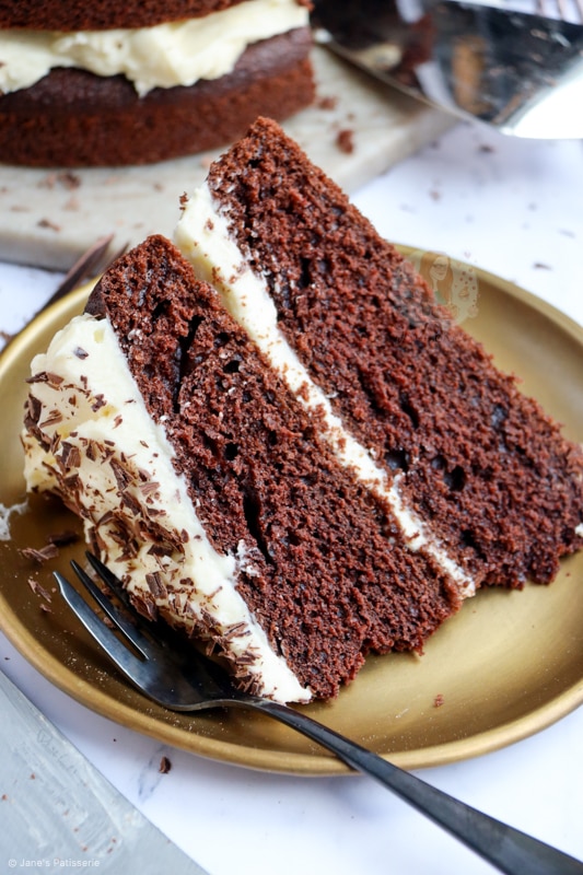 When you think of this cake, you basically need to think of my chocolate fudge cake, with a couple of changes. My fudge cake uses ingredients such as melted chocolate, buttermilk, and so on, but this cake does not need that. It’s not quite a standard chocolate cake either, but it’s in the middle!