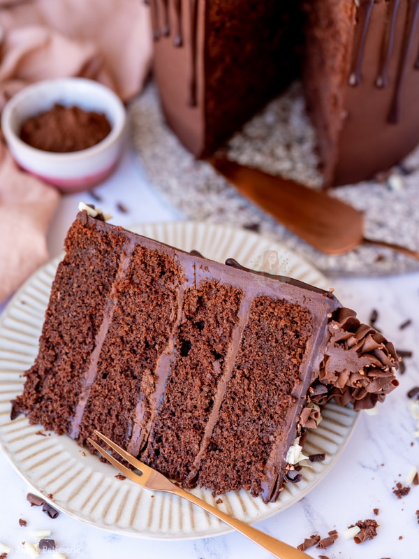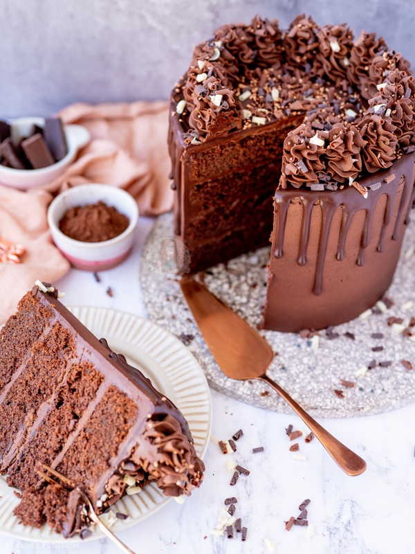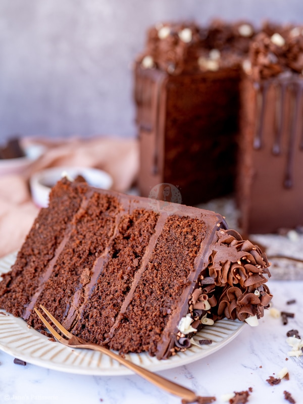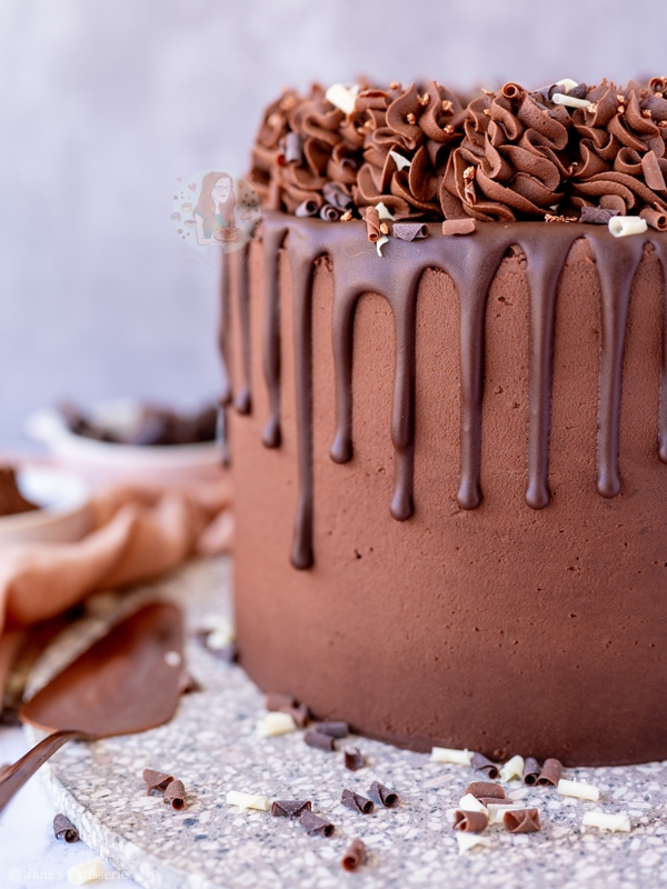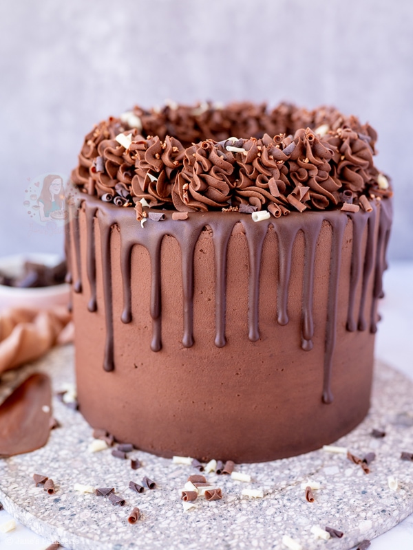 A four-layer chocolate drip cake with chocolate sponges, chocolate buttercream frosting and more – a part of my back to basics blog series!