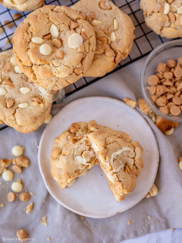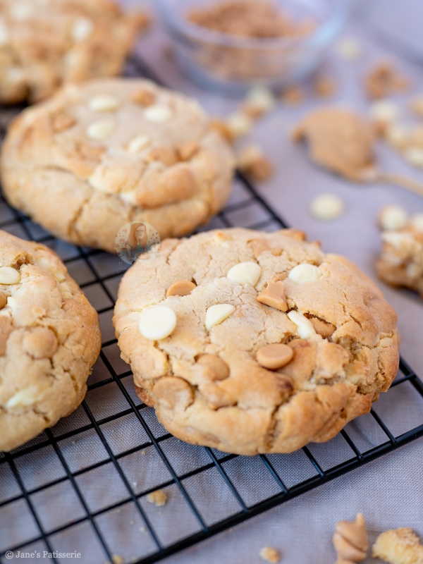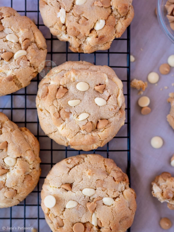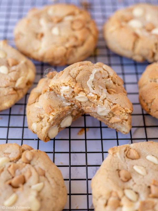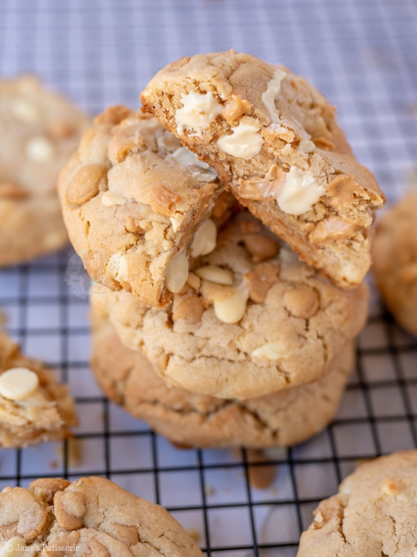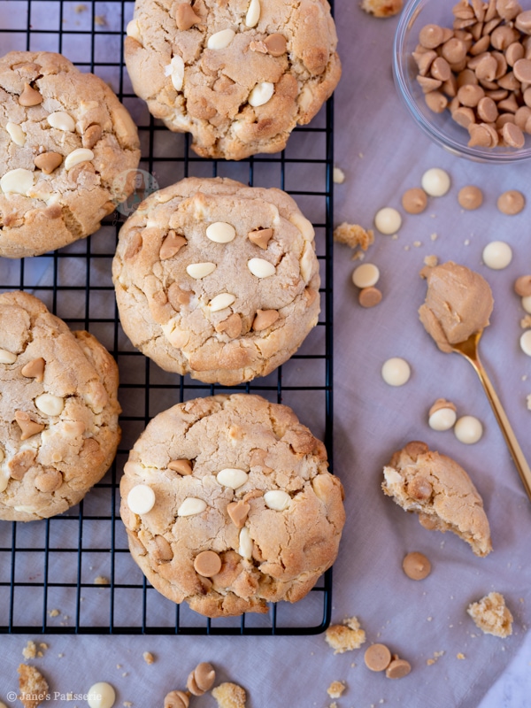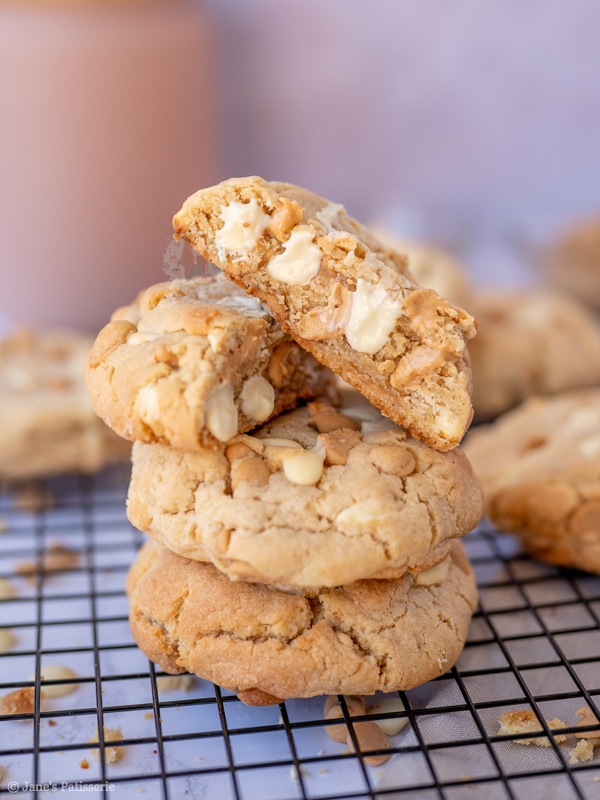 Giant, thick and chunky peanut butter NYC cookies stuffed with peanut butter chips, white chocolate chips, and more!
