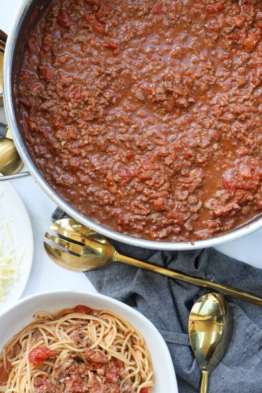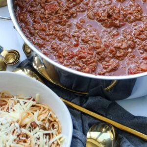 When it comes to a dish like this, it serves a healthy few portions of probably about 6-8 people, maybe even more. Serving sizes on something like a bolognese recipe can really vary so I say a guide of the 6-8 myself. I tend to make a batch of this delicious easy bolognese and then freeze into the portions I am going to use in the future as I don’t have eight people in the house.