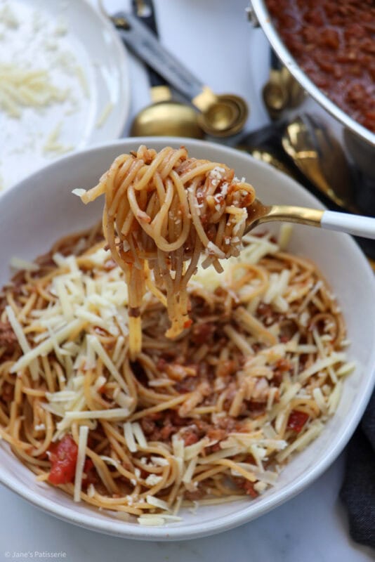 There are LOTS of opinions on how you should serve bolognese even just amongst the people that I know. I am not judging anyones methods, I am simply going to say how I have mine – with lots of pasta. I typically have spaghetti, as I like to stir the bolognese sauce through the freshly cooked pasta, and then add a layer of cheddar cheese and parmesan.