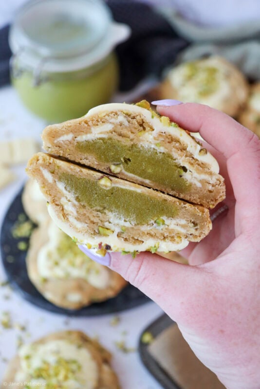 Thick and delicious pistachio NYC cookies stuffed with a homemade pistachio spread, dotted with white chocolate and chunks of pistachio.