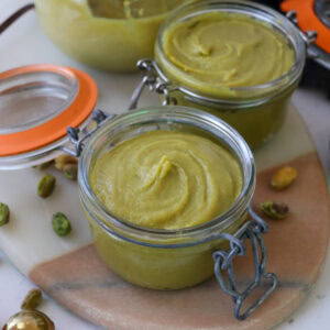 Pistachio butter to me, is like peanut butter, where if I was to make it, it would be 100% pistachios and that is it. You blend pistachios for a long time in a food processor until it creates its own butter. It’s the purest form really, and can be used as a base for many things.