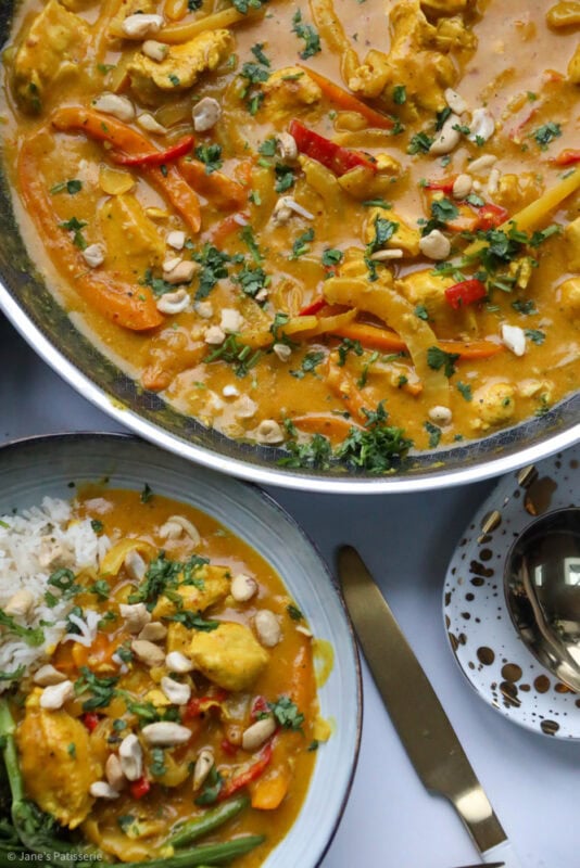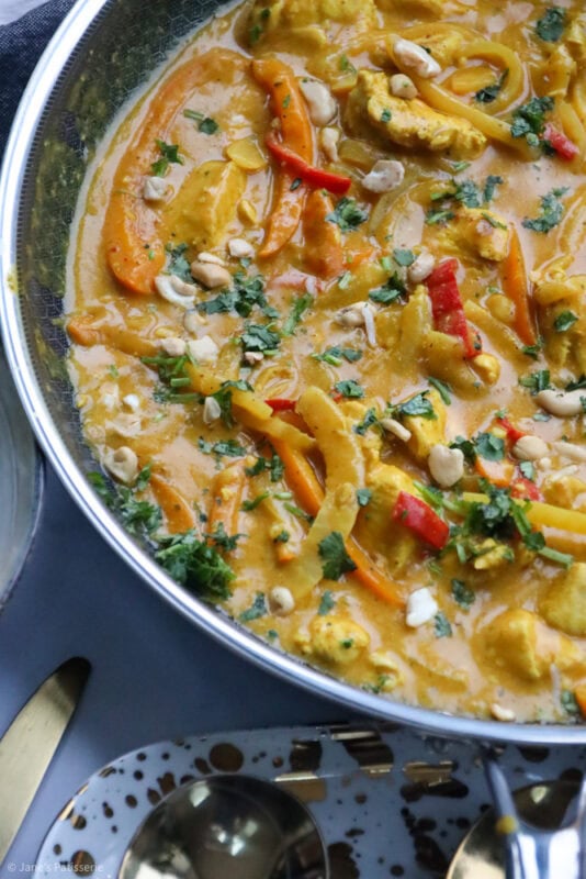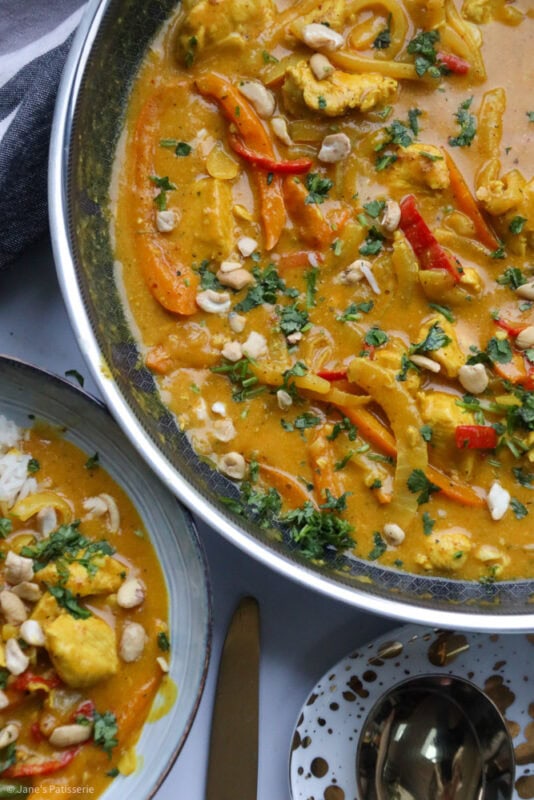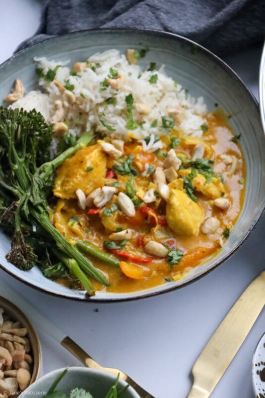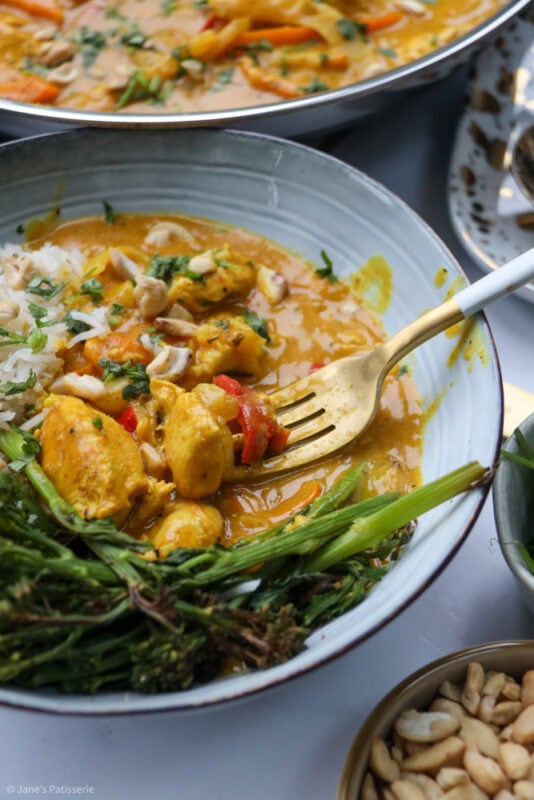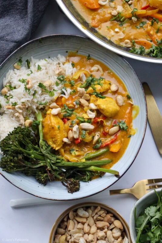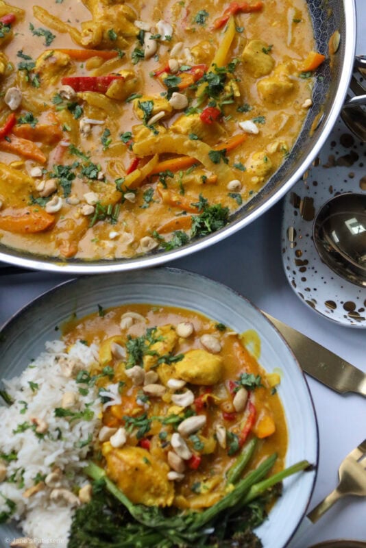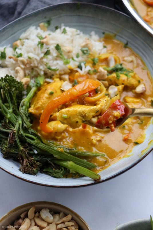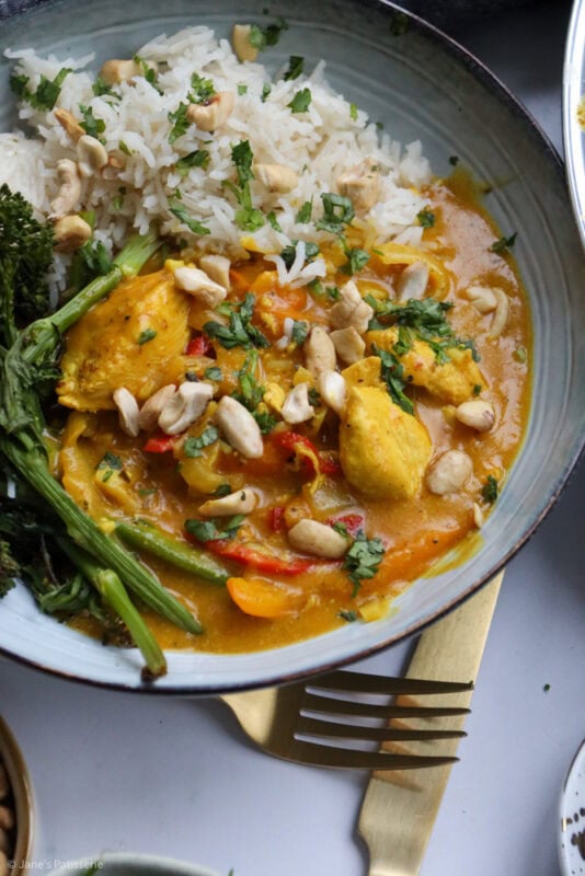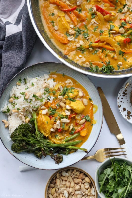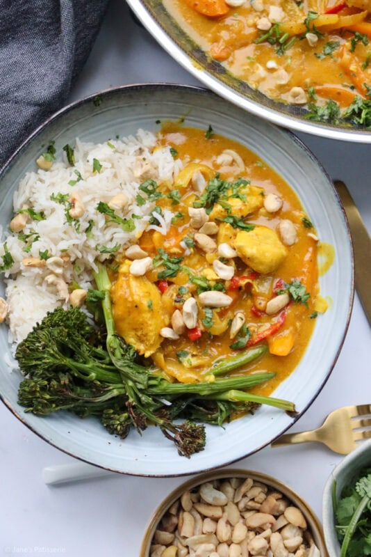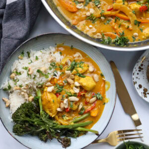 I typically serve the curry with coconut rice (as I am obsessed with it) and then also some veg. Like mentioned above, tenderstem broccoli is my favourite, but also a sprinkle of some chopped cashews and coriander – but there are no rules when it comes to serving something like this – you do you.