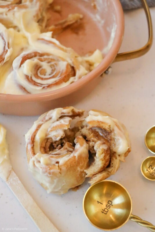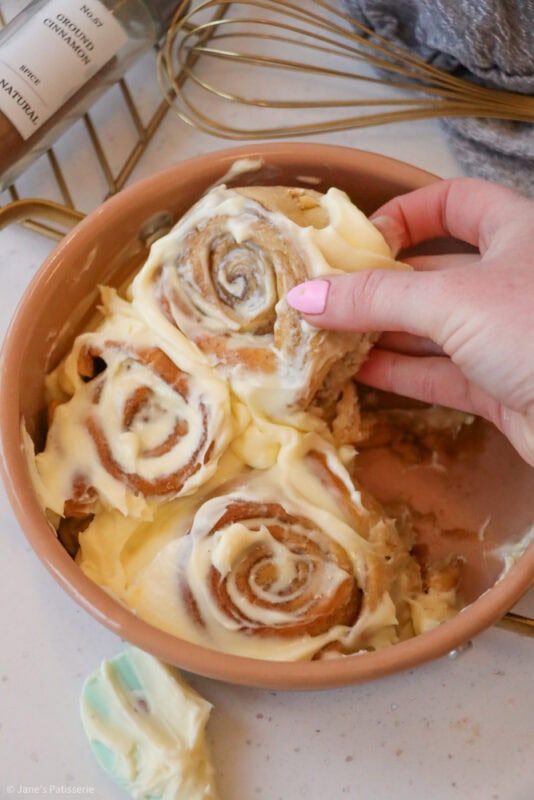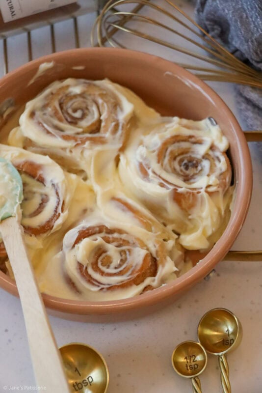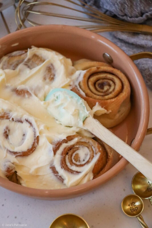 The baked cinnamon rolls are glorious when they are fresh out of the oven, smelling deliciously warm and cosy and I adore it. However, I love slathering a frosting on top – and whilst my regular cinnamon rolls have an icing drizzle, I do love the classic cream cheese frosting topping.