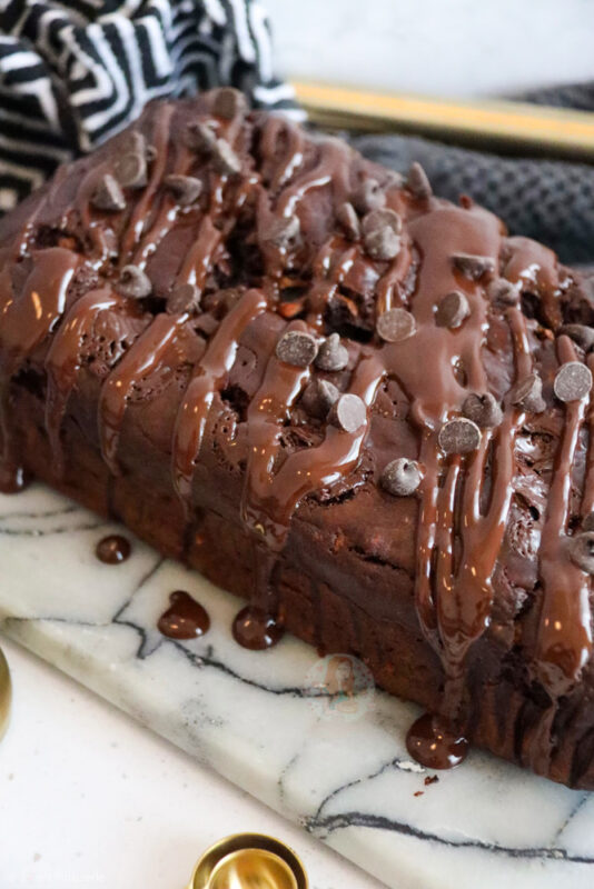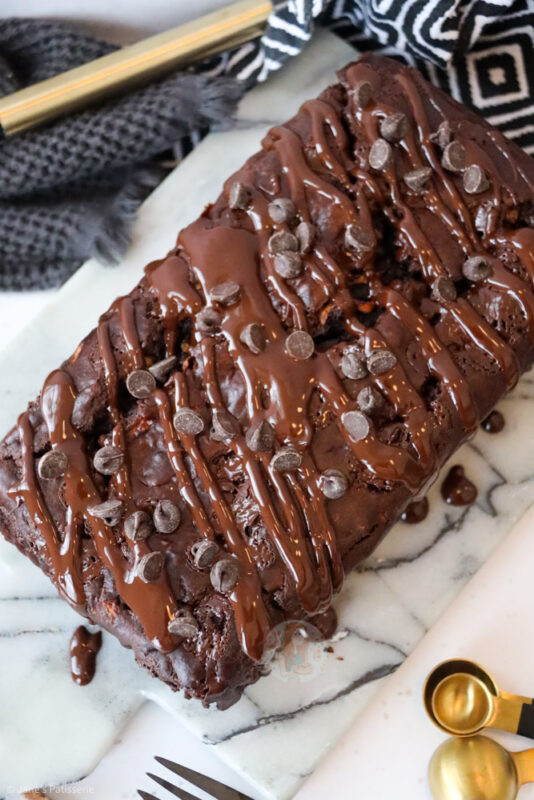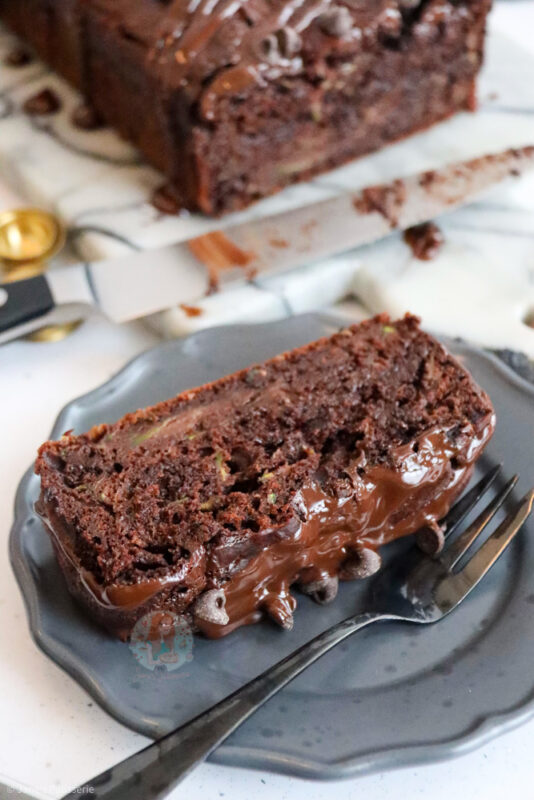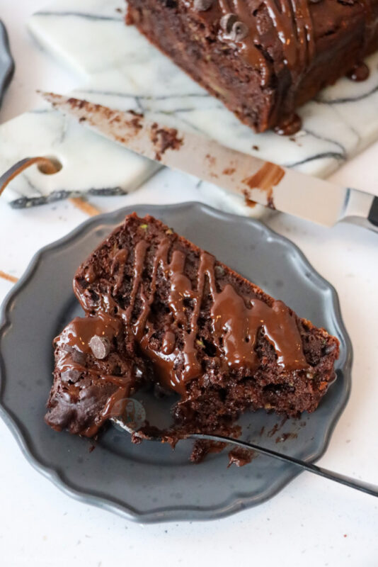 A deliciously simple and refined sugar free chocolate courgette loaf cake with chocolate chips and a chocolate drizzle